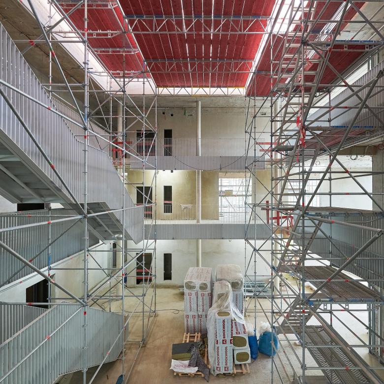 Der östliche Baustein am Schiffwasser - Die Hamburger öffentlichen Bücherhallen im Erdgeschoss, die Räume der Körberstiftung, das Bezirksamt und die gemeinsamen Flächen in den beiden Obergeschossen formen diesen Baustein. Die gemeinsamen Räume für Bewegung und die AWO sind im ruhigen südöstlichen Teil angeordnet. Dieser Baustein wird durch den südlichen Eingang an der Holzhude und durch den Haupteingang / Atrium erschlossen.