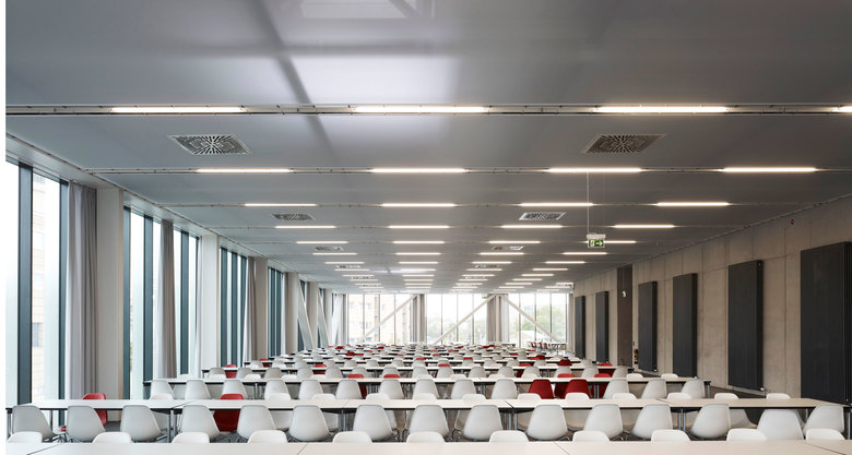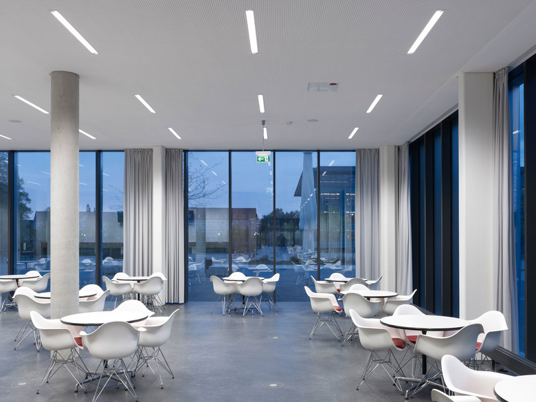 Die Haupttreppe verbinden die Geschosse, um eine kreuzungsfreie Erschließung zu ermöglichen. Der vollständig verglaste Speisesaal für 600 Gäste ist stützenfrei, um auch große Veranstaltungen zu ermöglichen.