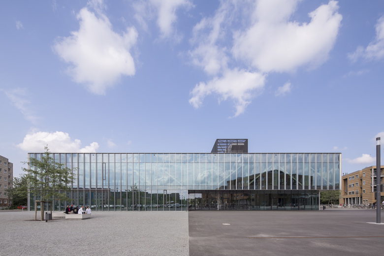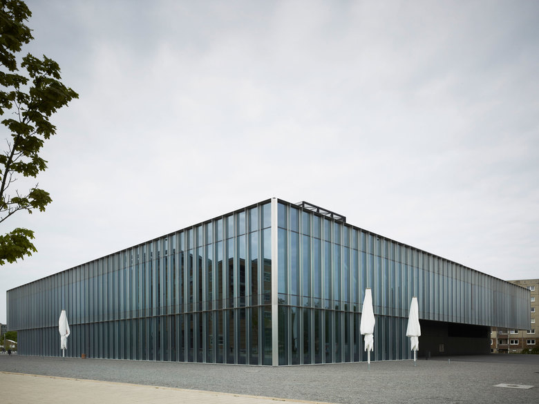 Filigran und Robust – Die Mensa ruht als gläserner Bau zwischen Berthold-Beitz-Platz und dem Haupteingang zum Klinikum. Die umgebenden Bauten aus Waschbeton, Klinkerfertigteilbauten und Putzfassaden aus den Epochen des letzten Jahrhunderts veranlassten uns einen gläsernen Solitär als Bindeglied mitten auf dem Platz zu entwerfen. Ein transparentes Gebäude, welches seine öffentliche Funktion direkt und unmittelbar nach aussen zeigt. Die zentrale Halle ist durch Zugänge im Norden und Süden erschlossen, so dass die Mensa städtebaulich zu einem Bindeglied zwischen Institutsgebäuden, Bibliothek und Klinikum wird. Der Speisesaal mit seinen 600 Plätzen – also die eigentliche Mensa – befindet sich im Obergeschoss. Um die Eingänge deutlich hervorzuheben sind sie aus dem quadratischen Baukörper über Eck herausgeschnitten. Aus diesem substraktiven Verfahren, dem Wegnehmen von Masse aus dem Baukörpervolumen, entwickelt sich die Stahlfachwerkkonstruktion des darüberliegenden Mensageschosses. Raum hohe Diagonalen leiten die Kräfte der Auskragung in die Konstruktion aus Stahl ein. Die Stahlskelettkonstruktion ruht auf dem Sockelgeschoss aus sichtbarem Beton, in dem sich die Räume der Ver- und Entsorgung, die Cafeteria und ein repräsentativer Konferenzraum für das Klinikum befinden.