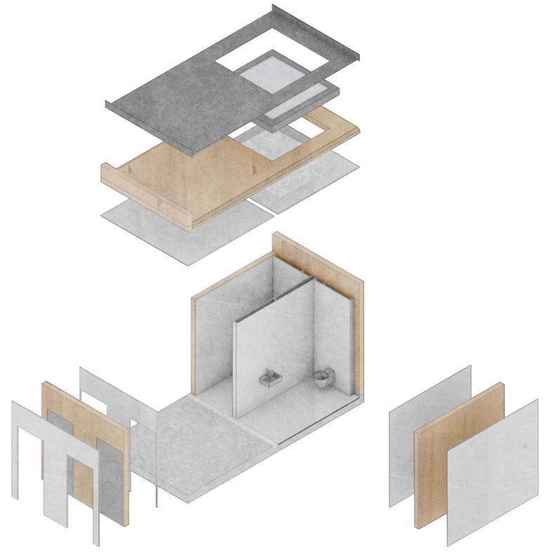 Als Konstruktion schlagen wir eine massive Dickholzstruktur vor, die den nachhaltigen Ansprüchen der Autobahn GmbH des Bundes gerecht wird. Die unbehandelte Oberfläche wittert mit der Zeit angemessen ab und gibt dem Baustoff einen lebendigen Charakter. Zur Ertüchtigung an die Nassraumanforderung werden die Innenräume vollständig mit Edelstahl beplankt. Die verwendeten Materialien ermöglichen einen langen Lebenszyklus, können aber nach seinem Ablauf sortenrein voneinander getrennt und wiederverwertet werden. Die Fassade kann den regionalen Gegebenheiten entsprechend mit einem weiteren Material verkleidet werden, das eine zusätzliche Vandalismussicherheit oder einen individuellen gestalterischen Ausdruck ermöglicht.