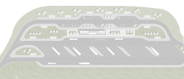 Der vorgesehene Bauplatz wird als Treffpunkt in der Mitte befestigt und mit punktförmigen Grünflächen versehen. Diese dienen zusätzlich als Spiel- und Sportflächen und laden zum Verweilen ein. Der Stellplatz für das geplante mobile Speiseangebot belebt den zentralen Platz zusätzlich. Über das Gelände verteilt befinden sich durch natürliche Bepflanzung gegliedert Vespertische, die einen Rückzug ermöglichen.