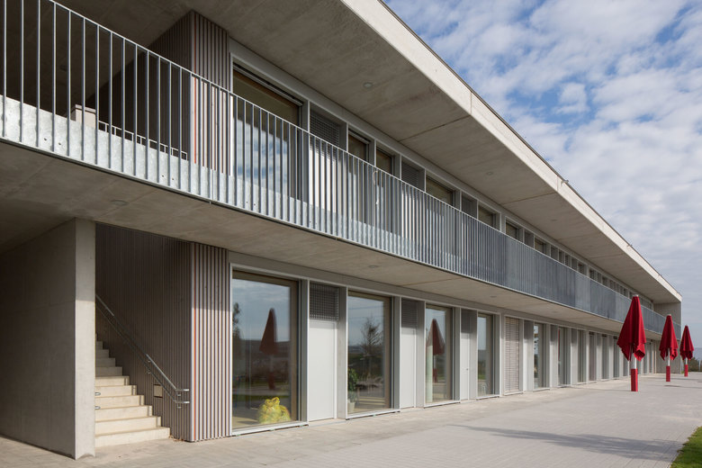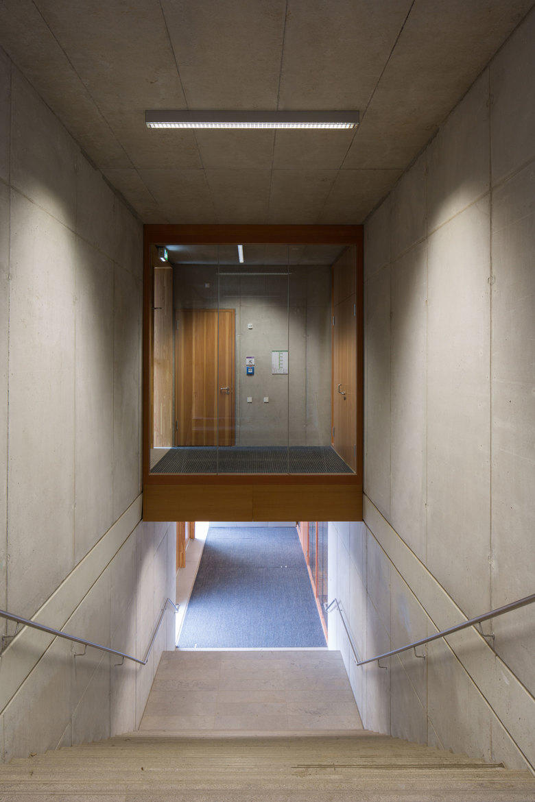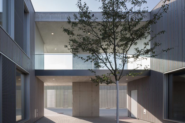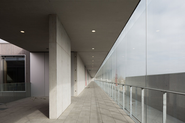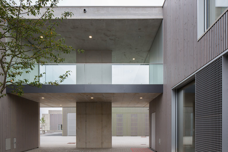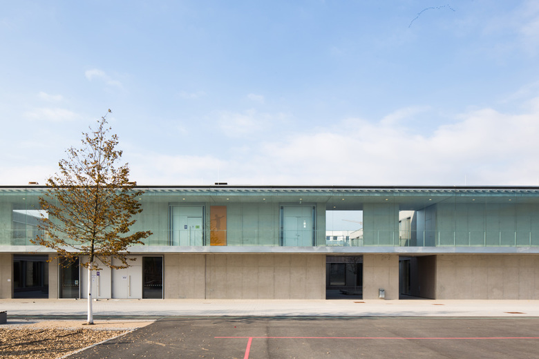 Die Freianlagen zeichnen sich durch eine einfache und reduzierte Gestaltung aus. Der Zugangsbereich und Durchgang zum Park definiert eine geschlossene Fläche, die sich wie ein Teppich unter die Grundschule schiebt.