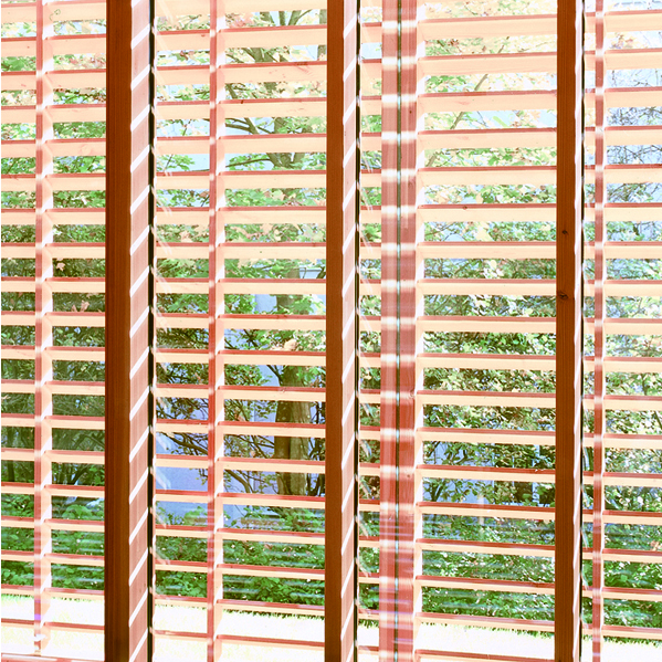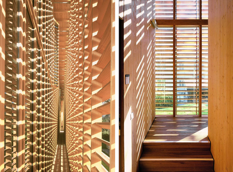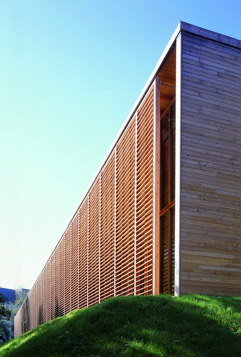 Das gänzlich aus Holz konstruierte Haus variiert die Anwendung des Materials in unterschiedlichen Texturen und Dimensionen. Die transparenten, gläsernen Nutzungsbereiche werden von einer aufgefächerten Holzwand umhüllt und geschützt. Durch die Trennung von thermischer Raumbegrenzung und Sonnen- und Wetterschutz ergibt sich ein offener Fassadenzwischenraum; überraschend unterschiedliche Lichtstimmungen bilden sich an der Fassade ab. Abwechslungsreiche räumliche Situationen zwischen Innen und Außen werden in der offenen Einhangshalle und an den Treppen variiert. Das zweigeschossige Foyer und die Treppen sind als offener Außenraum konzipiert, dadurch wird der Anteil der beheizten Fläche minimiert. Gleich einem Futteral sind die begrenzenden Flächen mit dem Material Holz belegt. Die umgebende Natur verzahnt sich räumlich mit dem Gebäude.