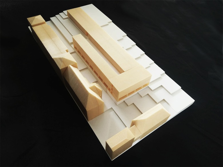Um eine homogene Erscheinung des Gesamtprojekts zu erreichen werden die Fassaden in Holz ausgeführt. Die erdberührenden Teile sind in Beton vorgesehen und vermitteln den Höhensprung zwischen den angrenzenden Straßen und dem Bestandsgelände. Um das Bestandsgebäude an der Nord- bzw. Ostseite abzufangen sind hier rückverankerte Abfangungen angedacht. Die tragenden Elemente sind als Sichtbetonwände vorgesehen. Das Bauwerk wird mittels der drei Treppenkerne ausgesteift und trägt die Lasten im Regelfall über Wandschotten ab.