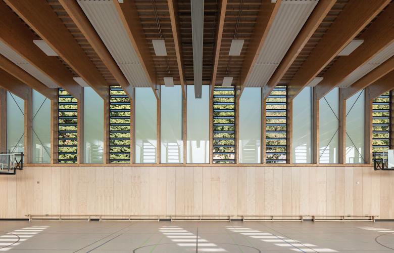 Ideal für die Schaffung von Funktionsräumen der Sporthallen, die Vorfertigung und den Transport auf die Baustelle ist ein Grundraster von 3 x 3 Metern. Holzelemente mit 3m Breite können problemlos transportiert werden und garantieren eine schnelle und somit wirtschaftliche Umsetzung der Planung. Der Baustoff Holz eignet sich in allen Bereichen für diese Bauaufgabe; im Innenraum erzeugt Holz ein angenehmes Raumklima; die Außenhaut aus Lärchenschalung ist wirtschaftlich sowohl in der Erstellung als auch im Betrieb. Die klare geometrische Zonierung von offenen und geschlossenen Elementen unterstützt die Umsetzung als Baukastensystem optimal.