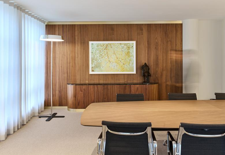 Im Rahmen des Ausbaus der unteren Geschosse wurde die räumliche Corporate Identity auch im dritten Bürogeschoss umgesetzt und der Boardroom und die Lounge neu gestaltet.
