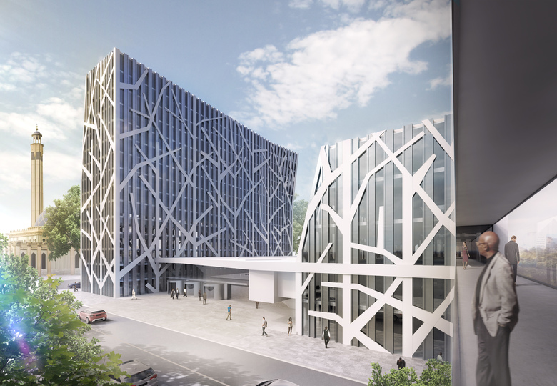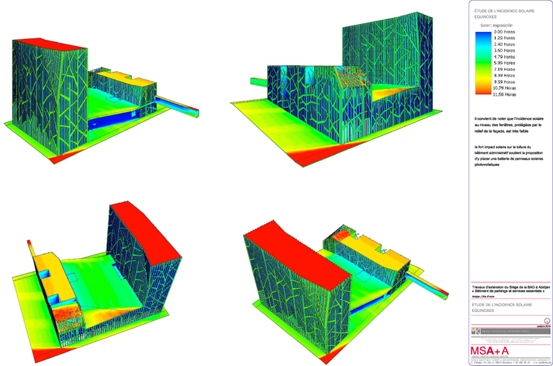 El edificio de oficinas se desarrolla en un volumen prismático que ocupa todo el frente del solar que mira hacia la Gran Mezquita. Se propone un edificio de catorce pisos de altura y 18,60 m de profundidad, dimensión que permite una ventilación transversal eficiente y un óptimo nivel de iluminación natural. En el frente opuesto del zócalo, el edificio de servicios se desarrolla en un volumen exteriormente simple, cuya complejidad interior responde a la diversidad de funciones que acoge. En sus seis plantas se distribuyen los diferentes servicios –área de restauración, agencia de viajes, correos, reprografía, agencias bancaria, guardería, centro médico, área de fitness y salas de oración–, así como los espacios de vinculación entre el conjunto de edificios que constituyen la nueva ampliación que se proyecta y la actual sede del BAD. La sala de conferencias ocupa el espacio central entre los dos edificios en altura. Su espacio de acceso comunica y relaciona todas las piezas del conjunto, al tiempo que facilita el uso independiente de cada espacio y articula las circulaciones de usuarios y visitantes con sus correspondientes controles de seguridad y acceso. El proyecto prevé que tenga una capacidad total de 1.200 personas, modulada y divisible en salas de distintos tamaños.