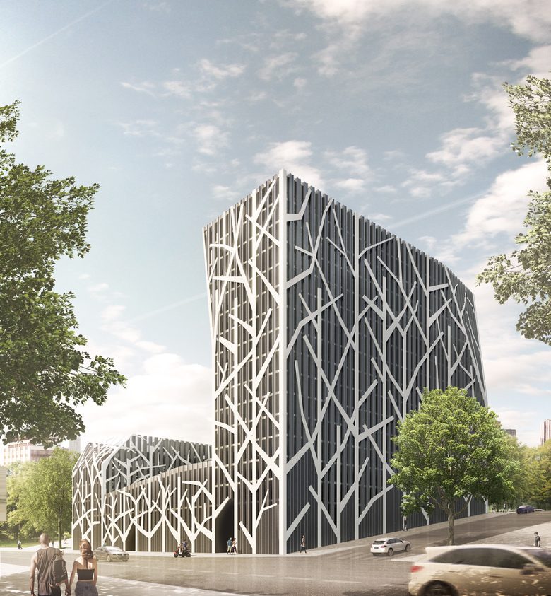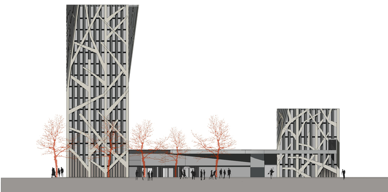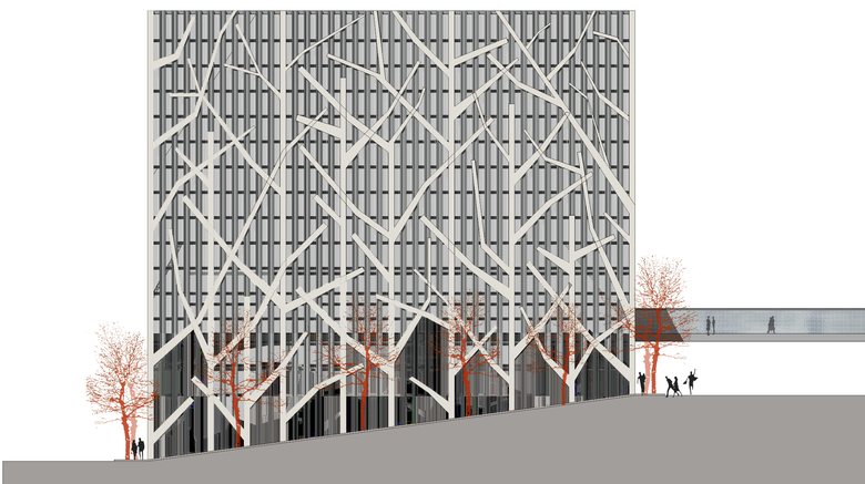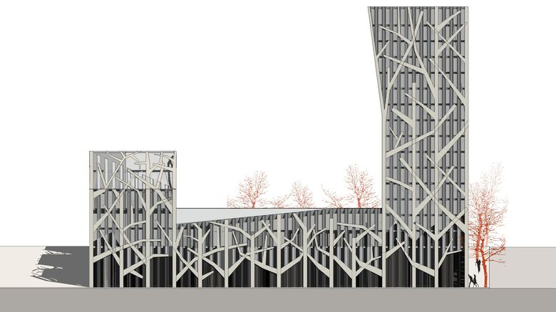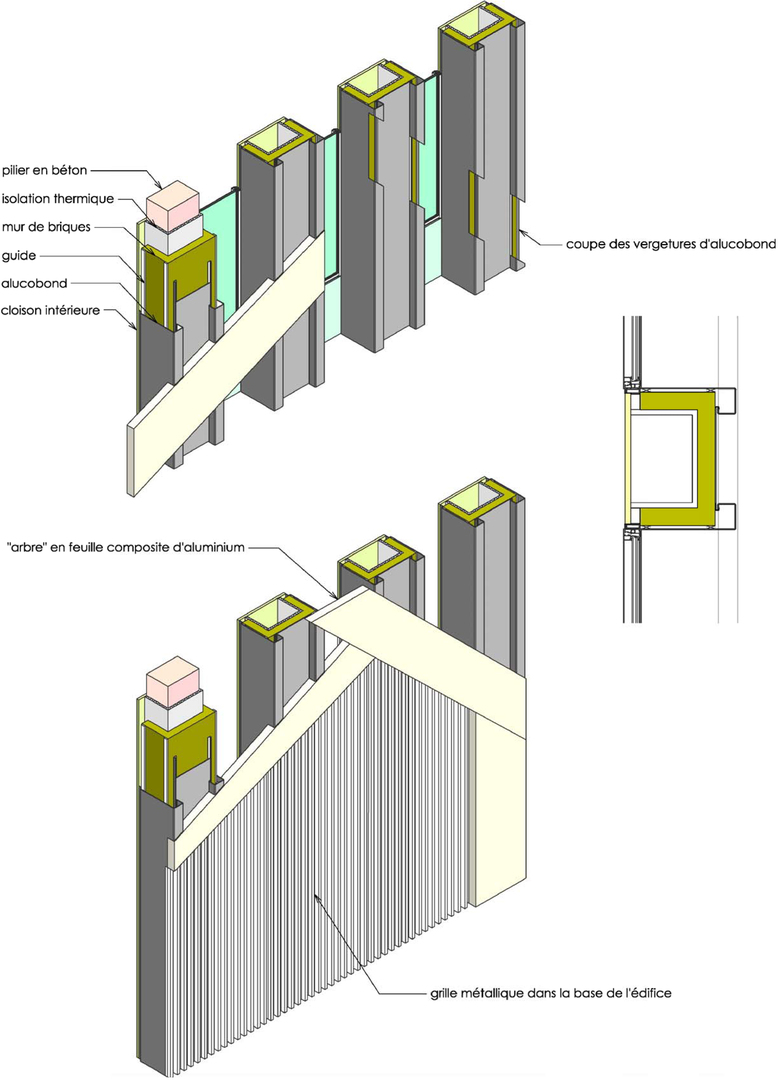 En su conjunto el proyecto se ajusta a una malla cuadrangular homogénea de 1,60 m de lado que compatibiliza dimensionalmente las distribuciones funcionales de los distintos pisos, al tiempo que racionaliza el diseño de la estructura y la modulación de las fachadas. Estas alternan macizos y huecos de un semimódulo de anchura, de forma que se consigue una proporción de aberturas adecuada a la elevada intensidad luminosa del emplazamiento. Algunos de estos macizos verticales, con acabado exterior de composite de aluminio, se singularizan desde el nivel de contacto con la calle transformándose en los «troncos» principales de un brise-soleil arborescente que extiende un sistema de «ramas» entrecruzadas en toda la altura de los edificios, referencia iconográfica a los bosques como elemento identificador del país y a la madera como sector fundamental de su economía.