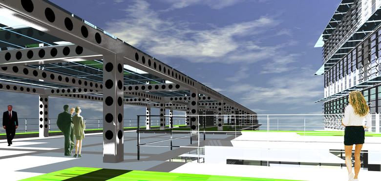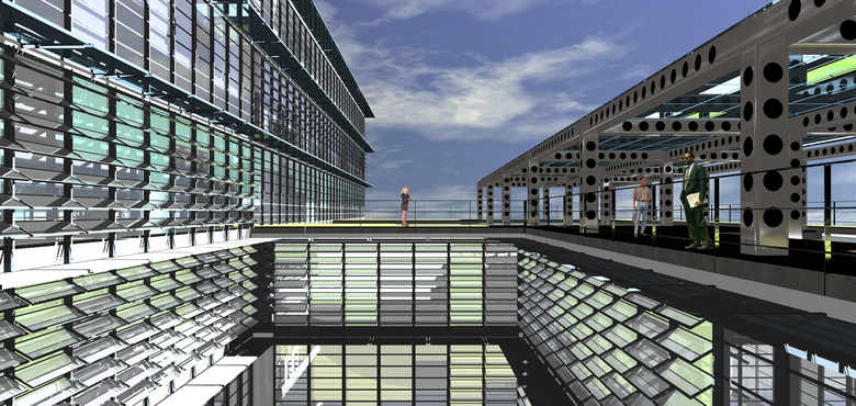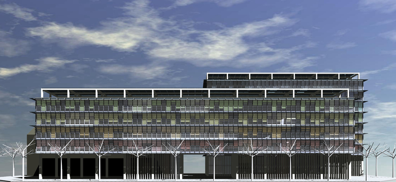 La fachada se resuelve con doble piel y equipada con un sistema de lamas regulables para el control pasivo de la radiación y la transmitancia térmicas. La cubierta fotovoltaica se compone de un conjunto de 5.300 m2 de placas que se distribuyen entre las pérgolas situadas sobre las cubiertas ajardinadas y las cornisas de fachada que en cada piso son a la vez elementos de protección y de captación solar.