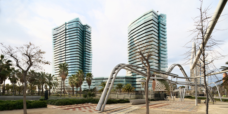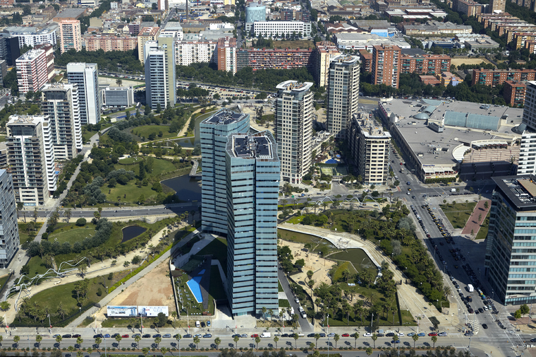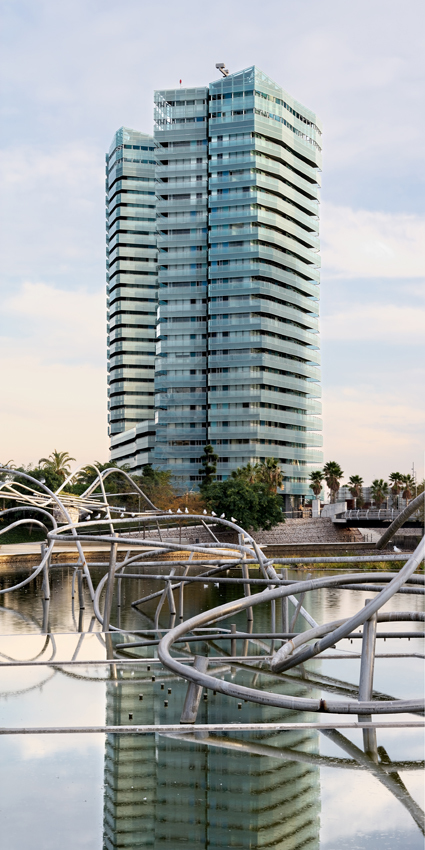 La estructura resistente de las torres se compone de un núcleo central coincidente con el núcleo de comunicaciones verticales, y de una línea perimetral discontinua de pantallas de hormigón que delimita el cerramiento exterior. Más allá de esta línea de fachada estructural se produce un vuelo de las losas de forjado, de profundidad variable, que configura las amplias terrazas perimetrales y modela planta a planta el volumen aparente de cada edificio, conformando estratégicamente pliegues, fragmentos de plano en pendiente o extraplomados y aristas vivas.