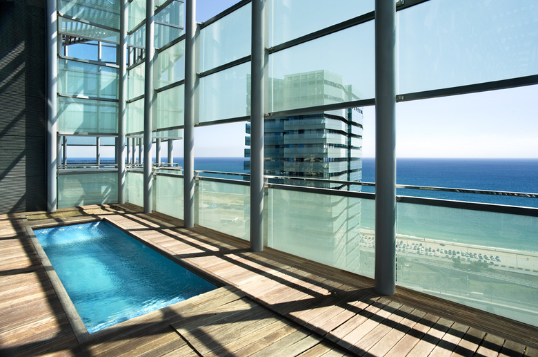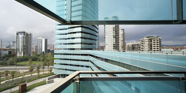 El plano de fachada exterior, formado por franjas horizontales continuas de vidrio serigrafiado, protege las terrazas y filtra y matiza la percepción del volumen interior, acabado también con un revestimiento de vidrio coloreado. En función de la luz incidente y de la posición del espectador, los fragmentos de fachada varían a lo largo del día de transparentes a opacos, de reflectantes a satinados, y ofrecen imágenes y matices cambiantes de color, brillo y transparencia.