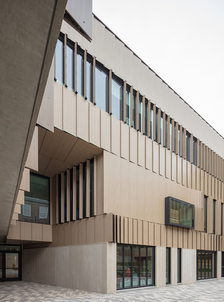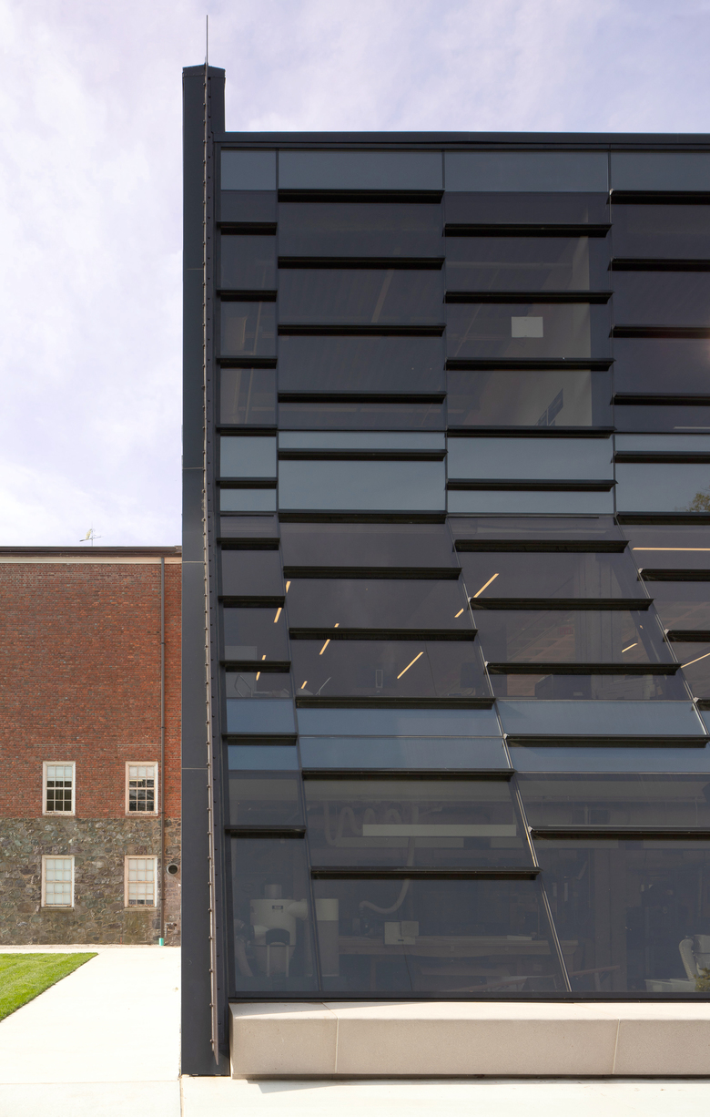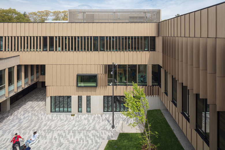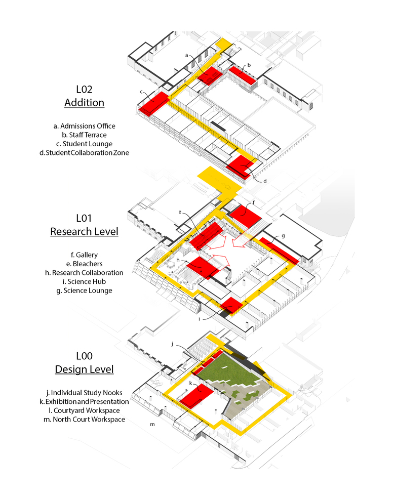 The newly enclosed courtyard is an expansion of the Design Level that provides students with multiple ways to utilize the space; an opportunity for fresh air, an outdoor space to work and experiment, a spot to socialize, an outdoor classroom, and a place to host events. The new phenolic façade wraps around the 4 interior walls of the courtyard, unifying the old and the new.