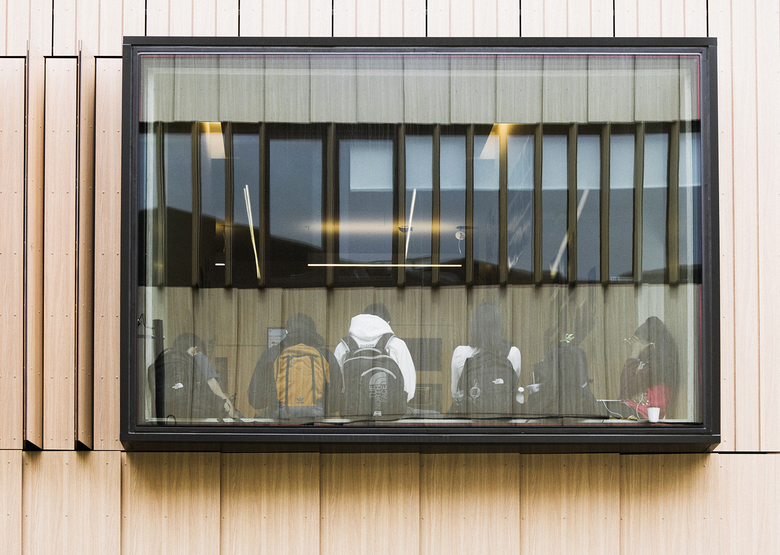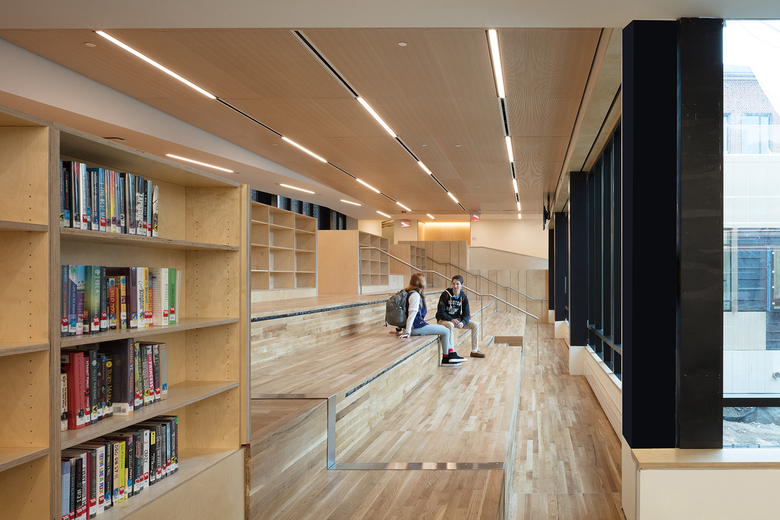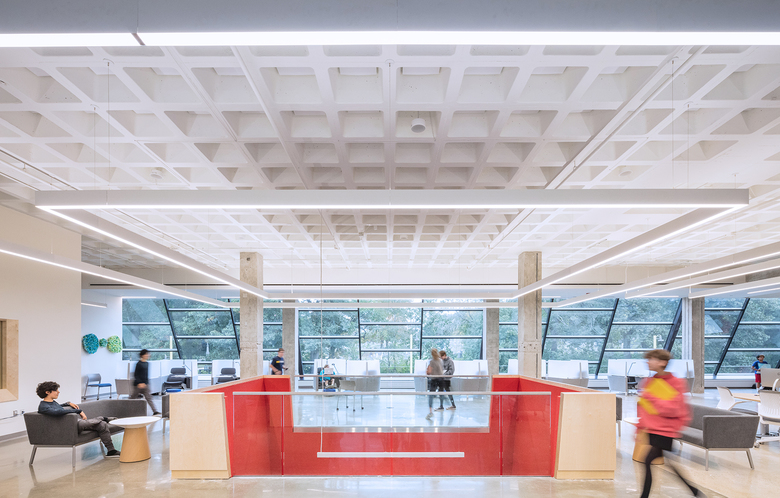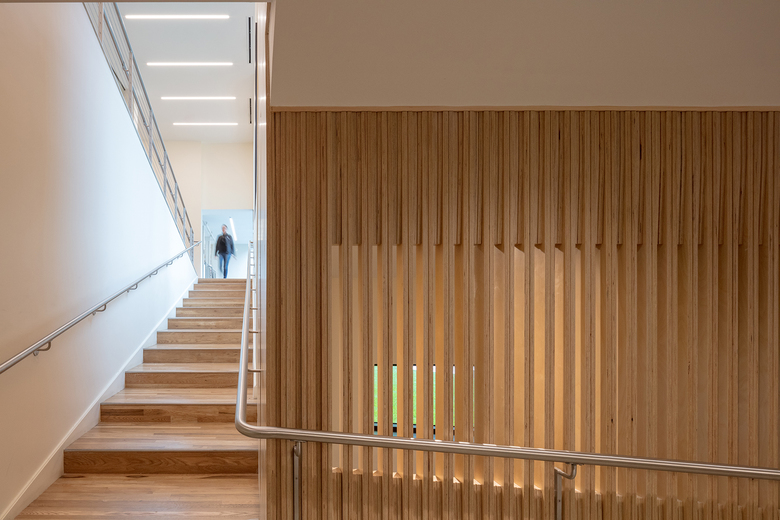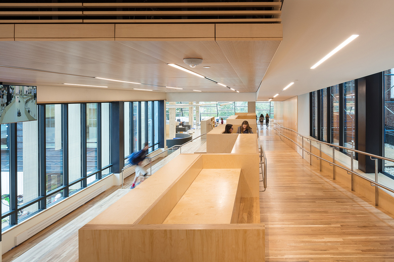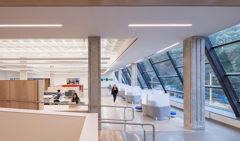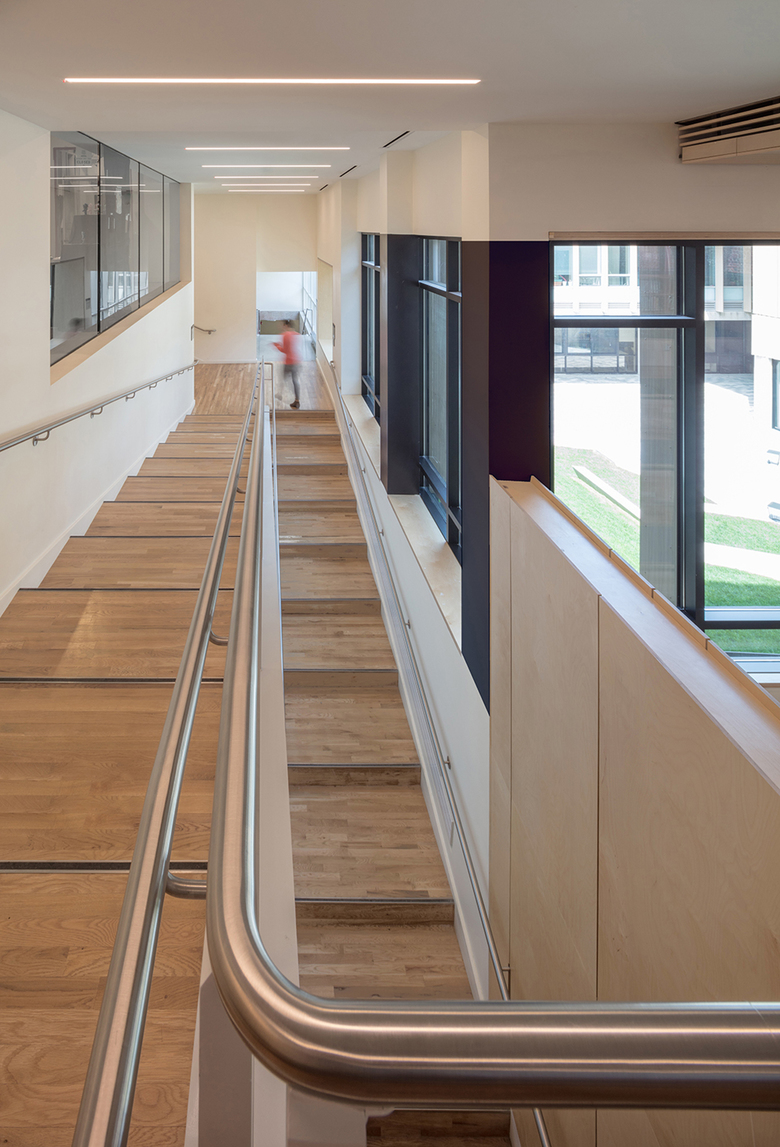 Across five structures built over the span of 90 years, there was an 8-foot elevation difference from adjacent floor levels, requiring an extensive ramp system to adjoin the levels. Thus, the design includes a three-story connecting “Bridge” that sponsors a variety of student-centered spaces: study carrels, presentation spaces, and lounge areas.
