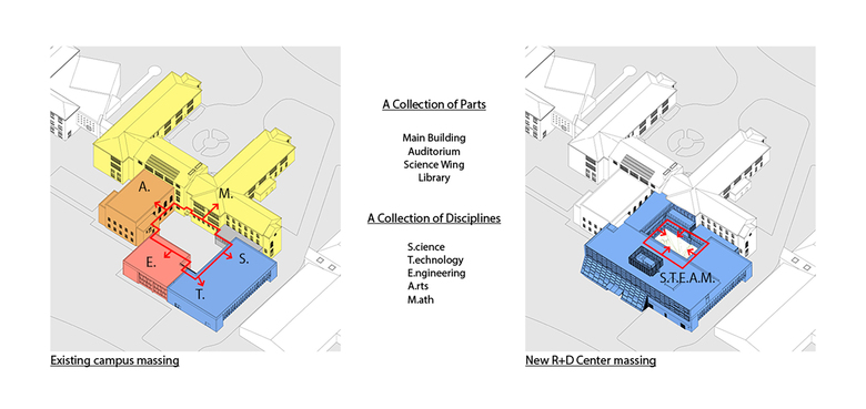 Beaver Country Day School is an independent school for grades 6-12 near Boston that boasts an innovative pedagogy based on student-centered design. A new Research + Design facility was commissioned to reflect the ambition of the faculty and students to expand the nature of their school. The project involved 16,500 sf of renovation and a 24,000 sf new addition that created a connected campus, placing the new R+D Center at the heart of it.
