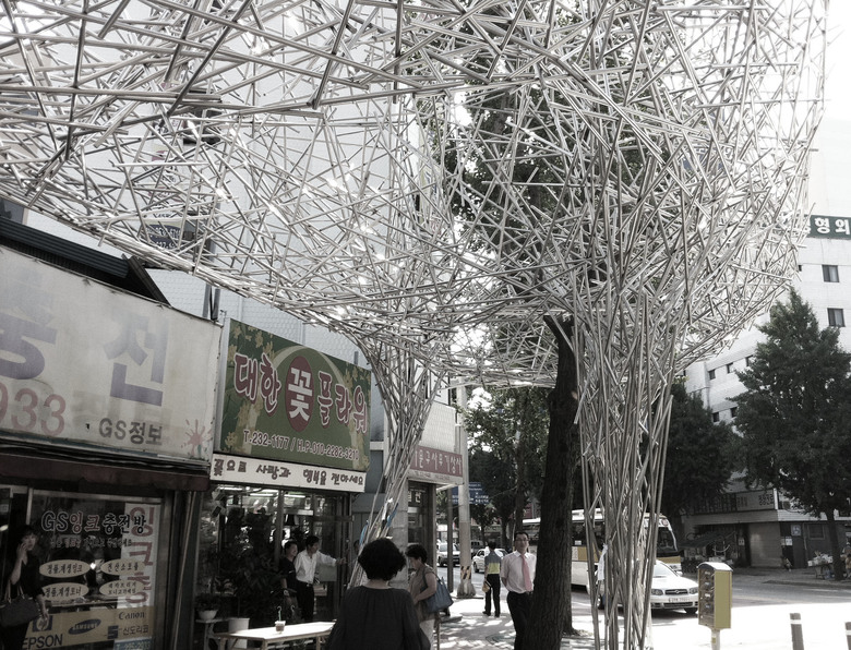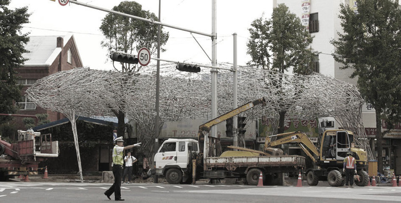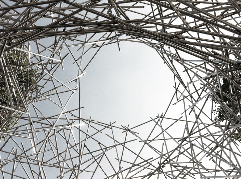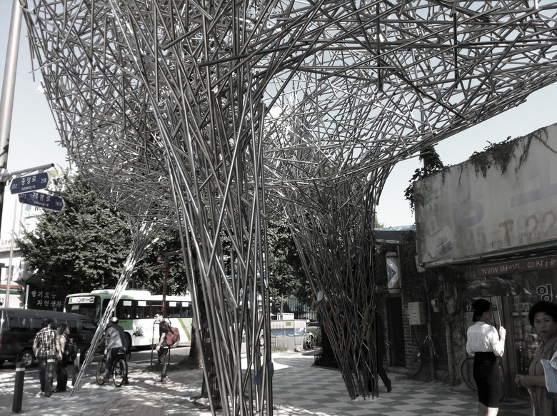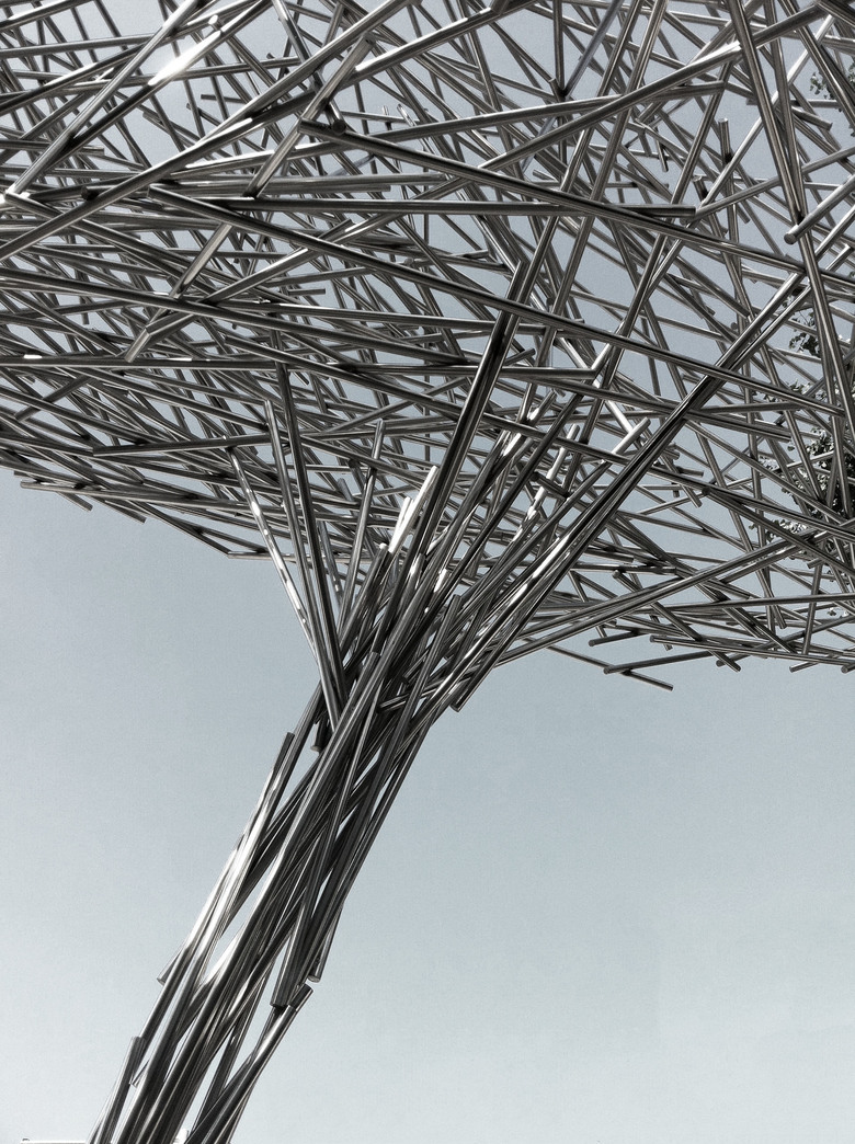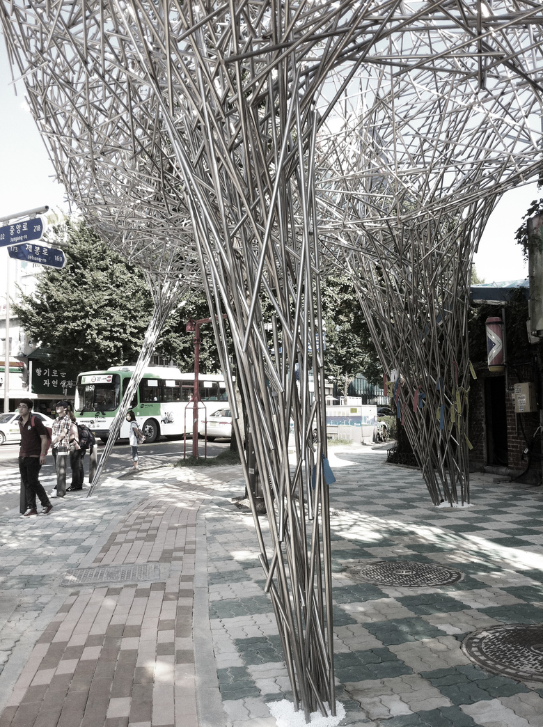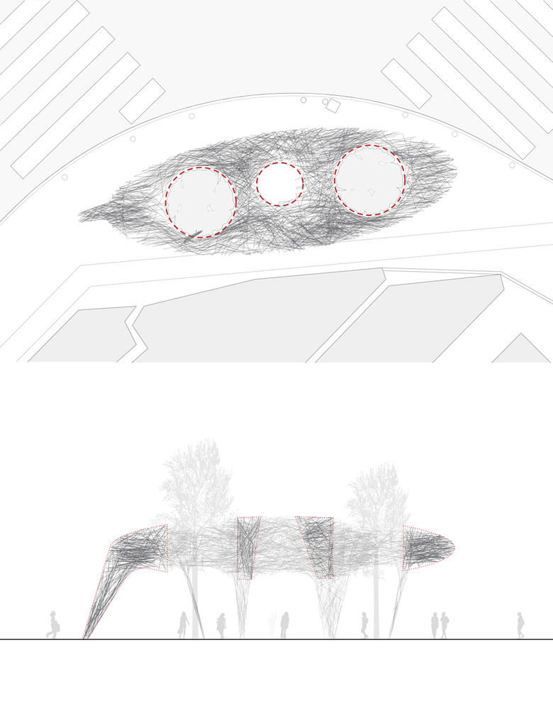 With the completion of working drawings for an elaborately cantilevered tensegrity structure, NADAAA was politely notified to change all tension members into compressive struts. This gave rise to a radically alterative approach: the design of structural parameters within the formwork of a strict envelope that respects both the underground infrastructure and the landscape above ground. Working with a door handle manufacturer, stainless steel cylindrical handles are welded in three spots each, producing varying densities based on point load, compressive and lateral forces. The overall form is, then, the result of the reconciliation between the columns and the canopy, brought together by the seamless tectonic of compressive struts.