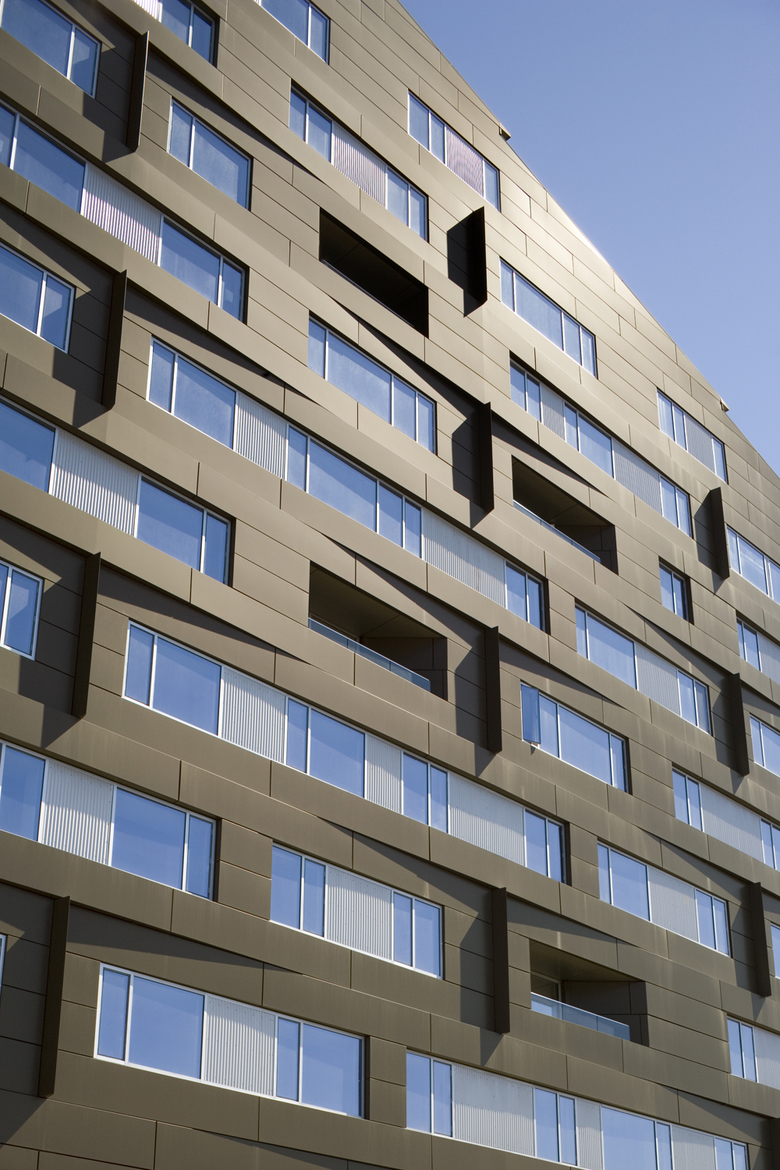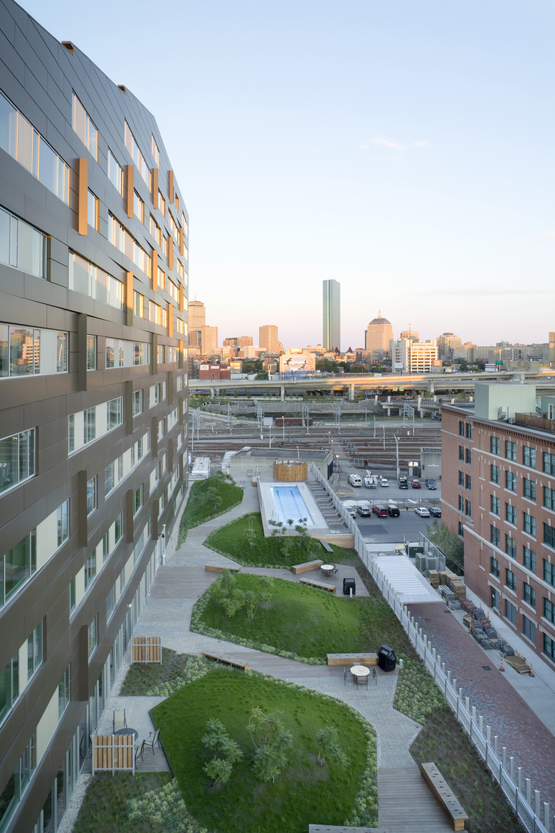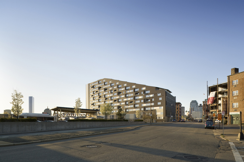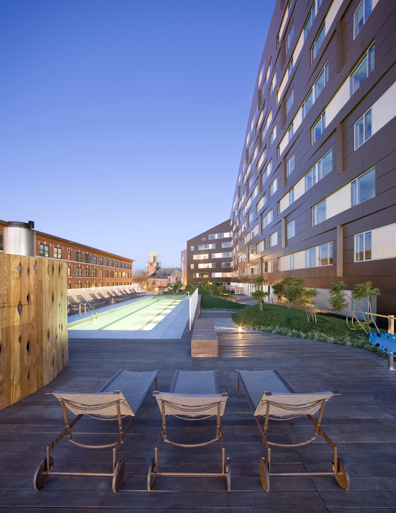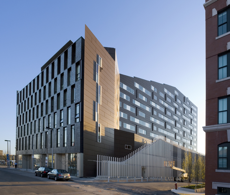 As a pivotal building in the urban revitalization of South Boston, the Macallen Building’s design requires a reassessment of conventional residential typologies to produce an innovative building that works within a developer’s financially competitive budget. Occupying a transitional site that mediates between highway off-ramps, an old residential fabric, and an industrial zone, the building negotiates different scales and urban configurations. The design addresses two scales and the different edge conditions of the surrounding context through varied spatial conditions, various ways of reacting to the public sphere, and accompanying material and façade articulations to reinforce the scales of interaction. On the western end, the building responds to the highway with a curtain wall yielding panoramic views for the residents inside the building. On the eastern end, brickwork mirrors that of the residential building fabric, extending the logic of the storefront and pedestrian scale elements on that facade. On the north and south facades, bronzed aluminum panels reflect the industrial neighborhood component and express the structural system organization. Additionally, the Macallen building was designed from the ground up to take advantage of “green” building techniques and materials. It is the first LEED certified building of its type in Boston.