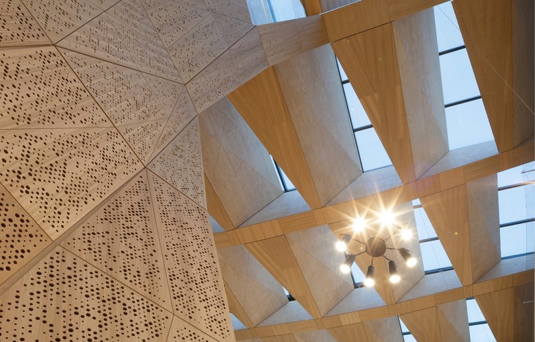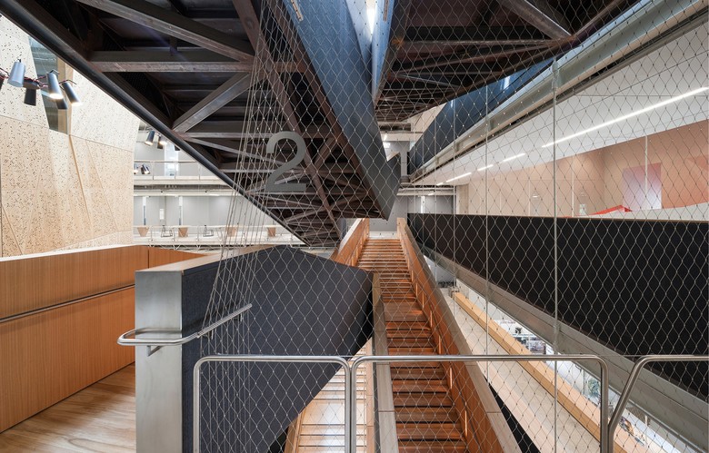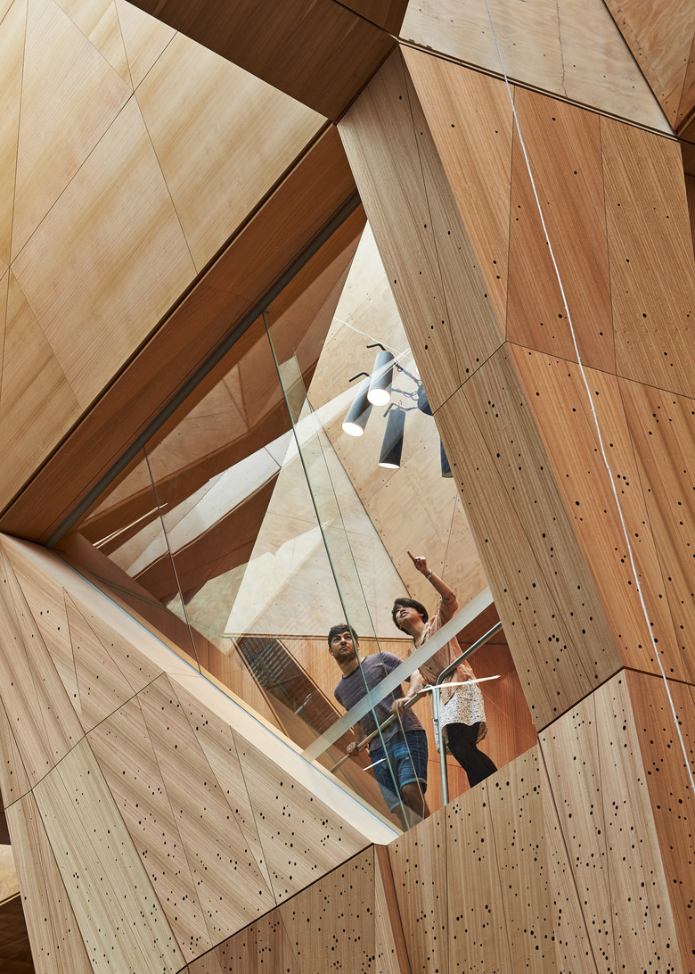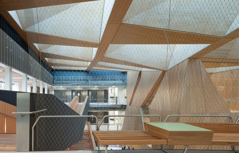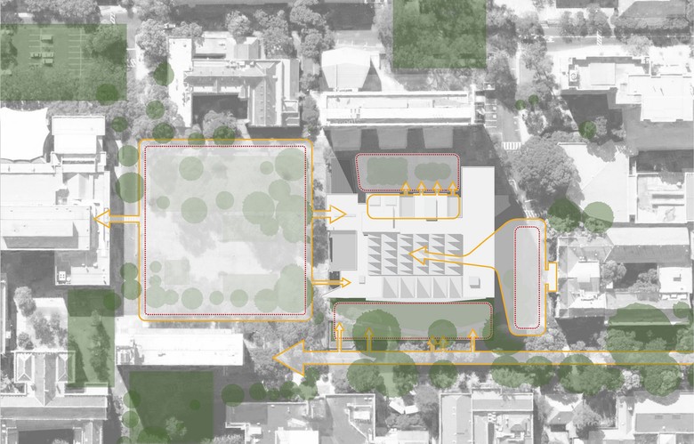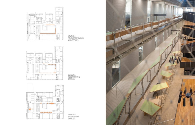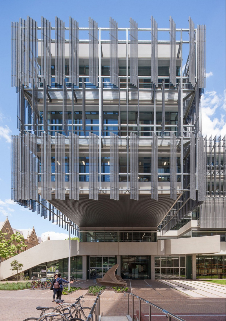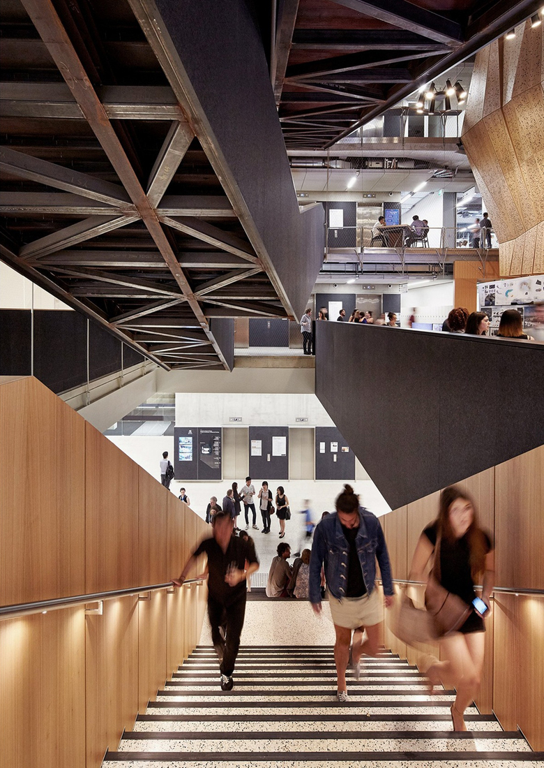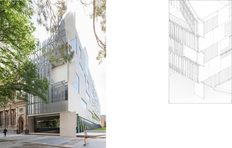 Following an international design competition JWA and NADAAA were appointed as architects to design the new Melbourne School of Design building for the University of Melbourne. The University embraced the unusual creative relationship proposed between the two practices as collaborative design partners across all aspects of the project. The project integrates the requirements of both the University’s Property and Campus Services and the Faculty. The design process has involved regular briefing meetings, workshops and presentations with various faculty user groups, University Committees and Reference groups. The building design responds to the planning principles set out in the 2008 University of Melbourne Parkville Campus Master Plan. The building design meets its briefed area and budget targets, comprising of 6 levels (basement plus five levels) and incorporates two lecture theatres, workshop, library, two exhibition spaces, cafe, a series of studios over three levels, a studio hall, and a series of associated academic and professional workspaces captured within the briefed 15,772 m2 GFA. Central to the design is the Studio Hall, a large flexible space that provides for informal occupation over all times of the day. The Studio Hall is enclosed to the west side by the former Bank of New South Wales façade, and to the east side the Studio Hall overlooks the new courtyard. It is spatially book ended at the east side by the heritage façade of the Elisabeth Murdoch building. The Studio Hall is enclosed by a coffered timber roof that mediates natural daylight and assists natural ventilation. The building has been designed to incorporate a number of innovative structural and services systems that combined with the building’s façade system contribute to achieving the targeted 6 star green star rated building.