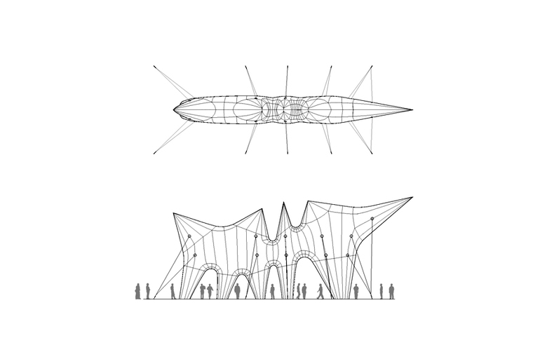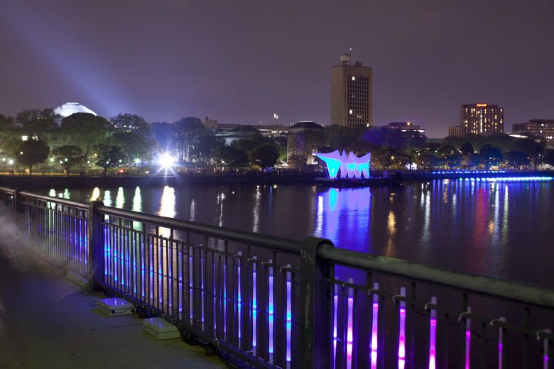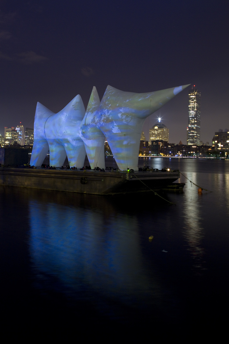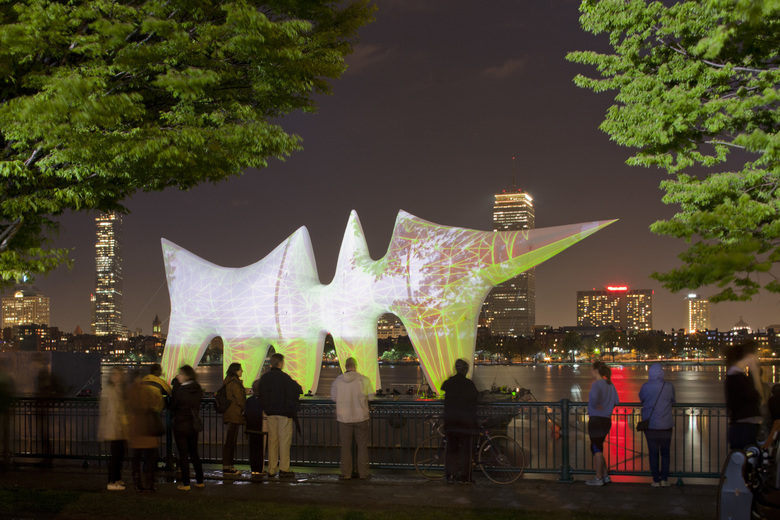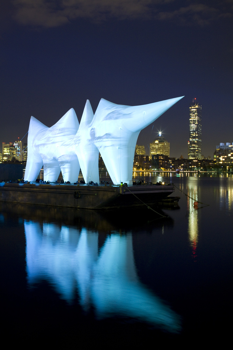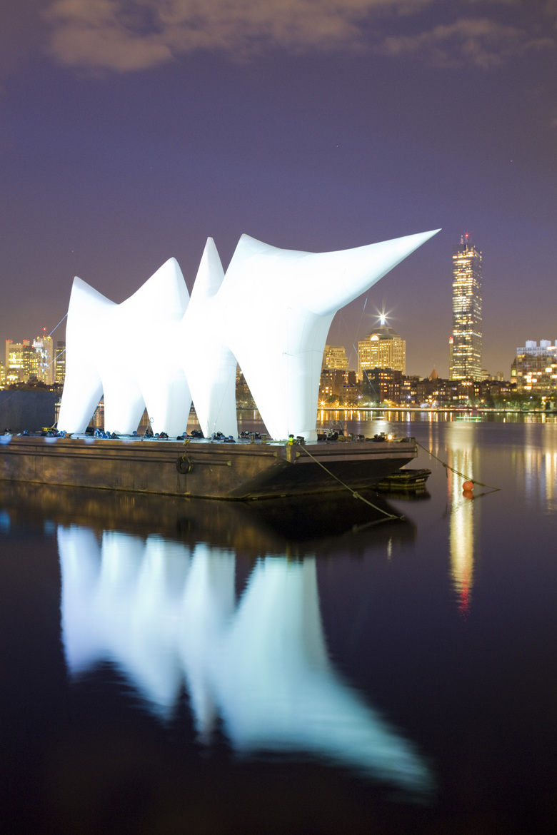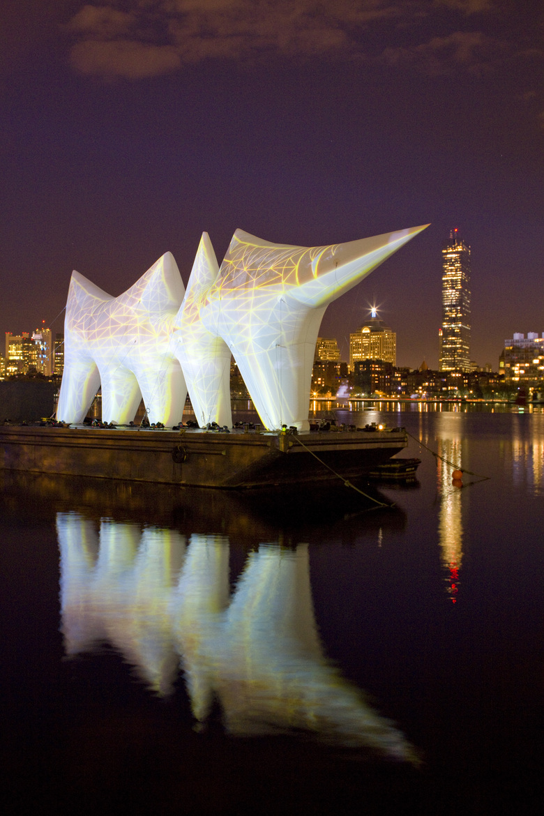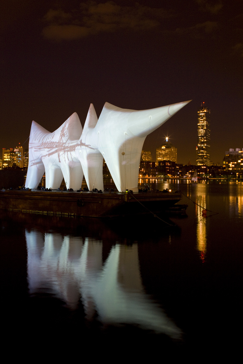Celebrating 150 years of MIT was also the occasion to celebrate the first School of Architecture in the United States. A series of cross-disciplinary works resulted in numerous installations bordering MIT on the Charles River. This installation, a collaboration between Gediminas Urbonas and NADAAA, was to produce a structure on the Charles that could serve multiple functions: as screen, as logo, as “light” structure, as skyline, and among other things, as a base for the revelation of historical research at MIT emerging from CAVS-- all documents retrieved and displayed from the hisotrical archives.