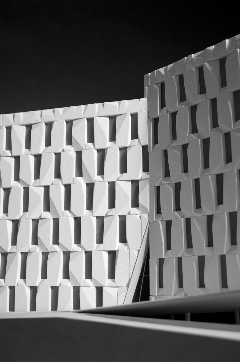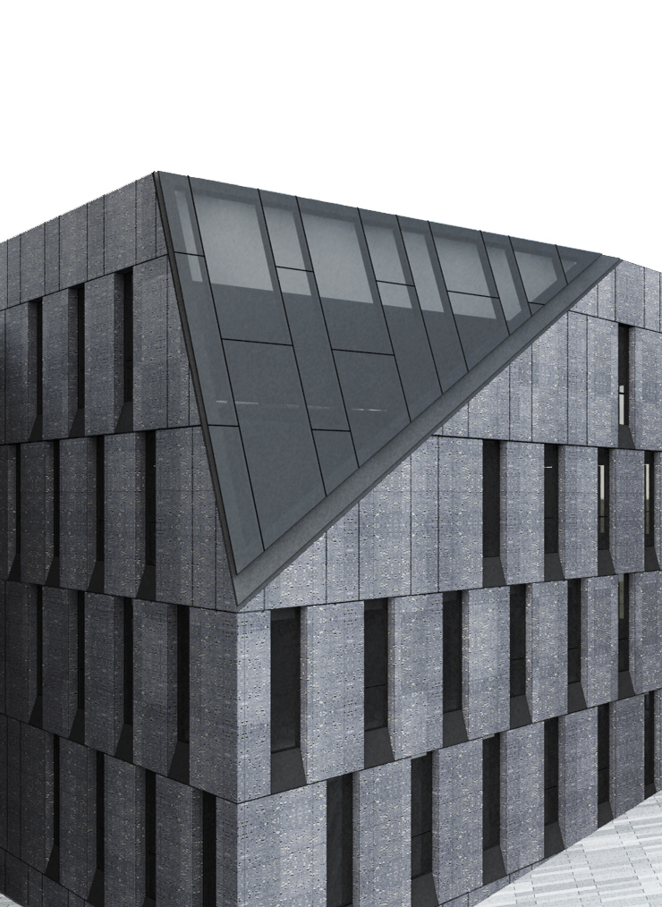 Clad in a local stone, the buildings have a pumice-like roughness which contrasts directly with the delicacy of entries and openings once they are revealed through the carefully controlled “slicing” of the cubes. Panels of stone are arrayed on the facade, producing a language of rhythmic openings, which themselves become part of a more finely grained differentiation of workspaces.