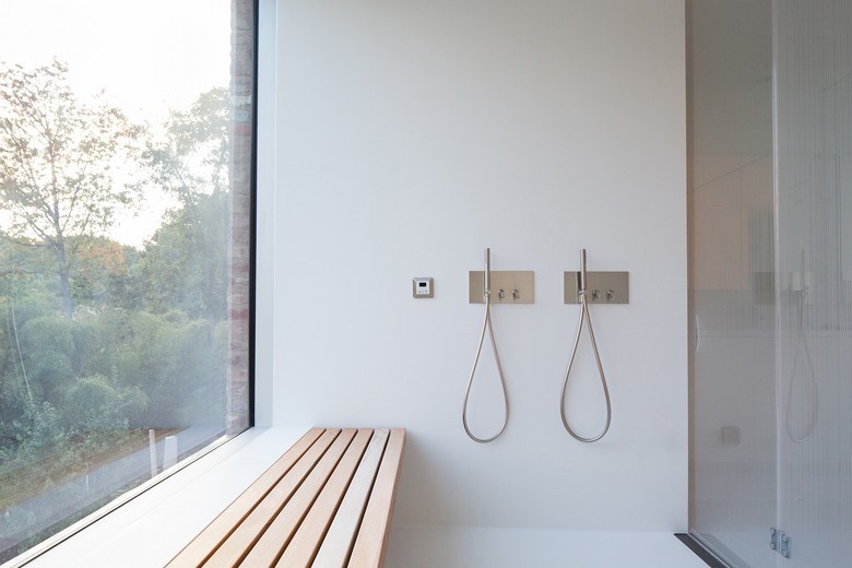 The perimeter structural wall, composed of brick, is reorganized around a north-south bias to mark the axial transition of formal and closed spaces on the north, to the informal and exposed spaces of the south. In correspondence to this, internal structural framing runs east-west, connecting the brick party walls, while topped with a cladding of laminated plywood that serves the program of the house, running north-south in tandem with the orientation of the house. All elements are incorporated into these laminar striations: stairs, closets, seats, window frames, among other components. From a solid facade on the North to a transparent and glazed facade to the south, the tectonics of the house reinforces this transformation.