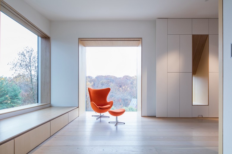 The most salient spatial intervention is the introduction of two multi-height spaces. The first connects the entry level down to the garden level, with a new living room that extends to the southern landscape. The second vertical space connects the entry up to the former attic, now a play loft capped by a skylight. With these two interventions the once stratified realms of storage, bedrooms, work areas, and living areas become seamlessly intertwined.