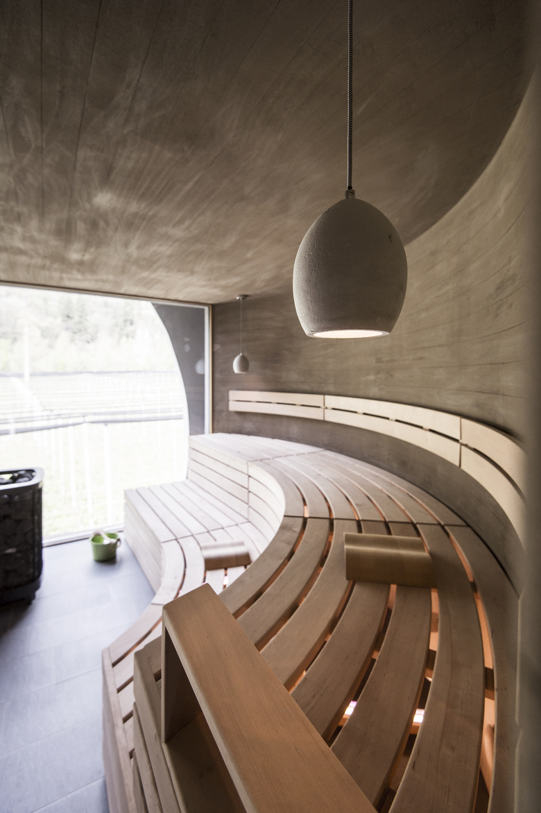 The interior is kept pure and dedicated to the elegance of the materials. The earth-coloured concrete walls pursue the lines of the wooden slats of the sauna benches and highlight the sloped form. Concrete lamps form the lighting of the interior. The big window opening allows the guests to enjoy the great view towards the surrounding nature.