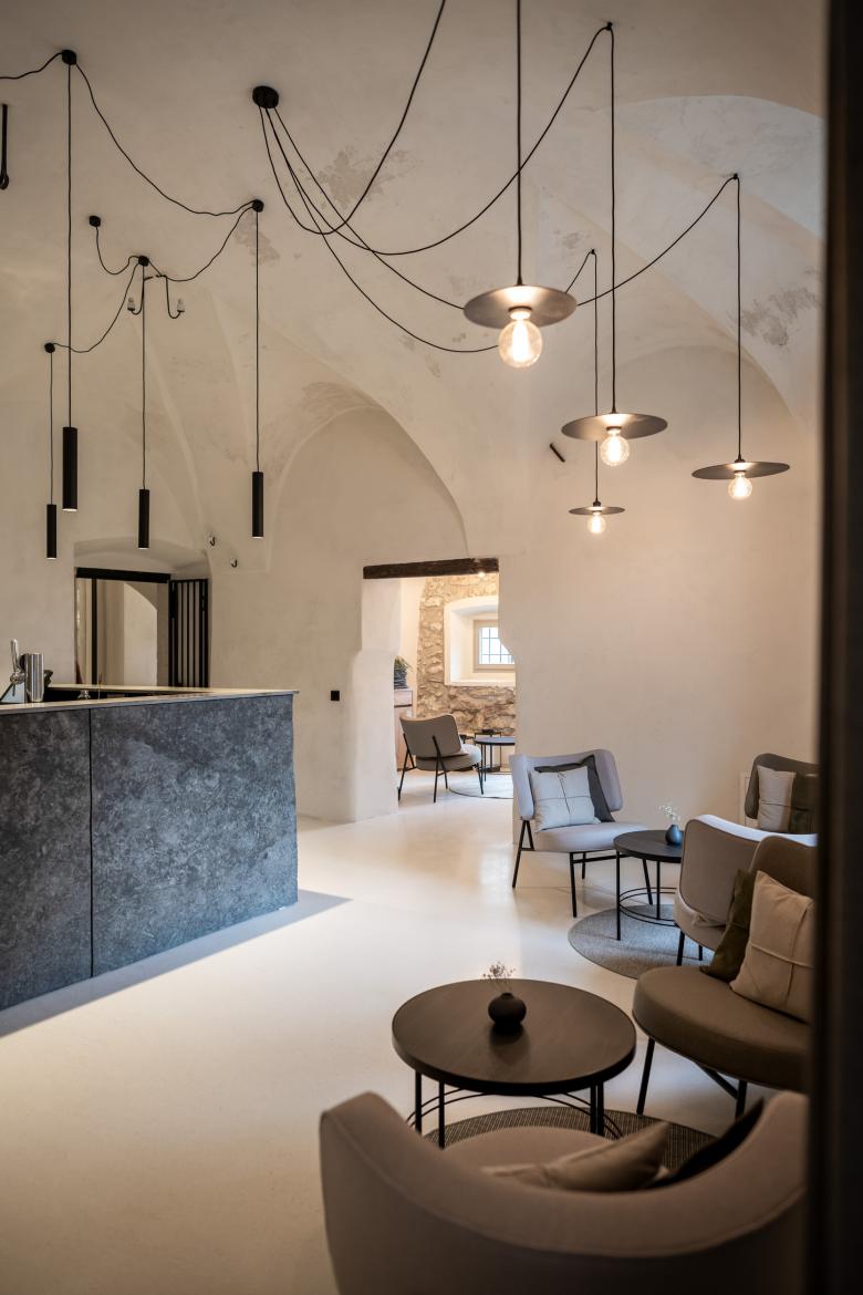 The original ceilings and decorations in the common spaces on the ground floor were conserved and restored. The dominant shades are white, grey and black, the historic colours of the monastery.