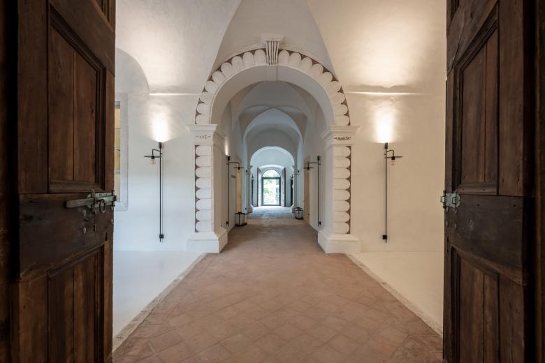 The concrete floors, are built over the original ones, with the exception of the corridor floor that leads from the main entrance to the internal garden, which maintains its original cotto covering after carefully restored. Following restoration and consolidation work, the walls and vaults were treated to create a rippled antique-effect plaster.