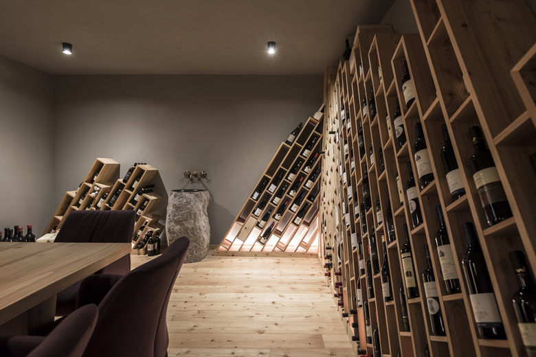 The design recalls the peaks of the mountains that rise towards the sky: the wooden shelves, in fact, create a sort of bookcase, characterized by inclined upright crafts of wood and elongated compartments that accommodate the individual bottles of wine (the refined choice of labels is personally selected by the sommelier owner).
