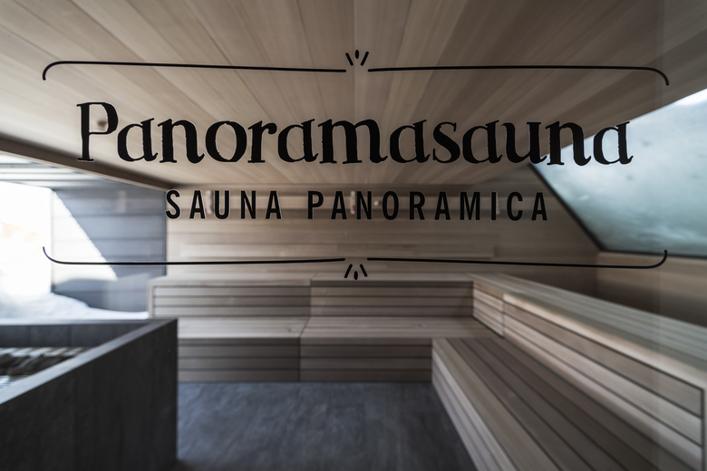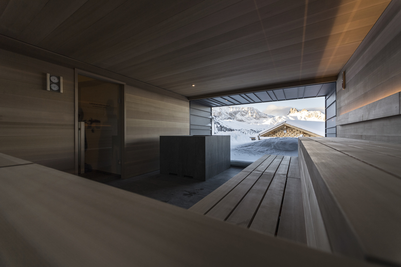 The wellness area stands in place of the pre-existing barn, as an independent building, with a metal-plated structure branches out, that houses the sauna, an awe-evoking environment, from the spatial point of view, with two large windows overlooking the landscape: the first looks towards the valley; the second opens on Mount Sassopiatto, with an inclination of 45 degrees (to allow the snow, during heavy snowfall, to flow to the base of the frame, leaving the view free). A relaxation area with a small distribution of hot and cold drinks completes the range of services, adding to the sense of comfort.