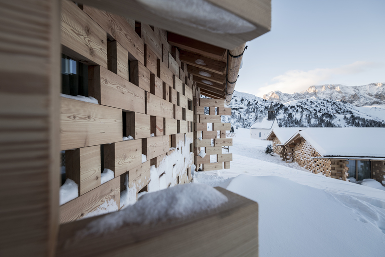 Noa*’s aim was to recover the traditional structure of the South Tyrolean mountain pastures in a modern way, which resulted in the design of the new chalets. The external claddings that surround the chalets are made of blocks of solid wood appearing to be stacked together in an alternation of full and empty spaces, becoming a dominant motif of the new settlement. The outcome, inspired by the structure of the ancient barns, avoids the annoying reflections of the exposed windows, inappropriate in a high mountain context. The wooden panels are designed to be able to open at the large windows, providing a view of the spectacular alpine scenery, while when they are closed create evocative light and shadows in the rooms, contributing to the relaxation of hotel guests.