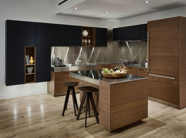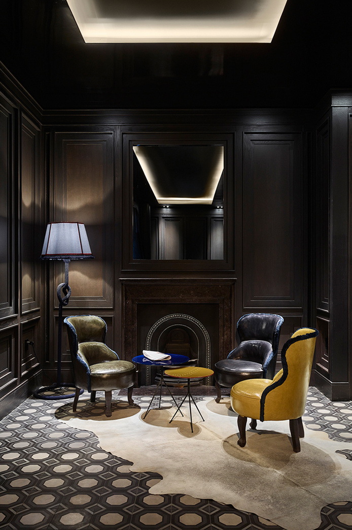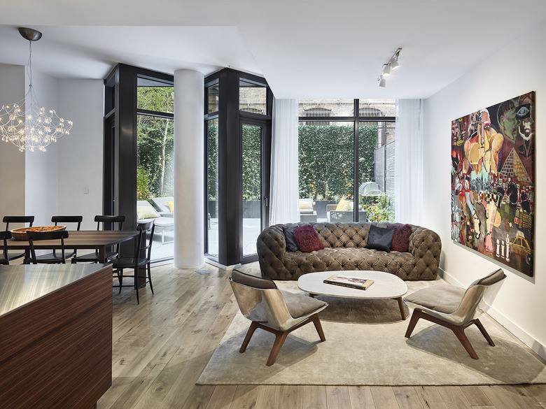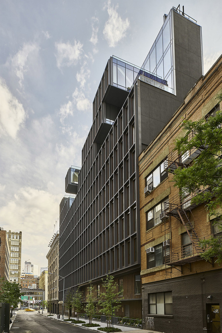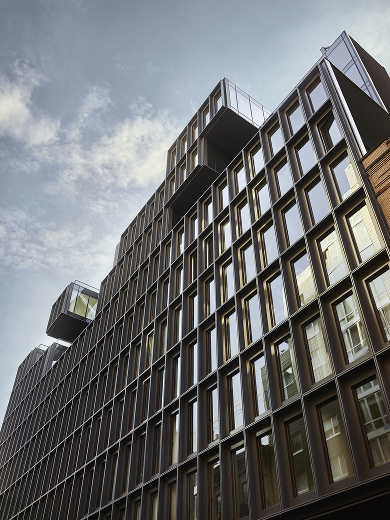 Situated in Hudson Square, between SoHo and Tribeca, 15 Renwick split typical setback zoning requirements to create slices of green and outdoor space in the building’s upper units. New York City’s strict dormer rule, which asserts that only a certain amount of floor area may encroach into the setback line, often limits architectural design, but, with this project, ODA saw this guideline as a launchpad for innovation. Manipulating the standard zoning dormer pyramid resulted in the discovery of spatial opportunity and a bolder link between indoor, outdoor, and semi-outdoor. A flying dormer structure is also employed, as opposed to columns, and can be seen from penthouse interiors. A seamless union of steel, wood, and glass, 15 Renwick’s façade is framed with dark aluminum reflective fins that, when touched by light, create shadow lines for recession and amplify privacy. When angled beneath the fins, pedestrians no longer have unrestricted eyesight into private spaces. These unitized systems were prefabricated for each residence, brought to the site, and quickly, easily installed. Step inside the lobby and panels speak the same design language as the façade. The exterior’s deep-set slim frames with wood-like inserts find renewed interpretation within the building, adding to its classic appeal and minimalistic details.