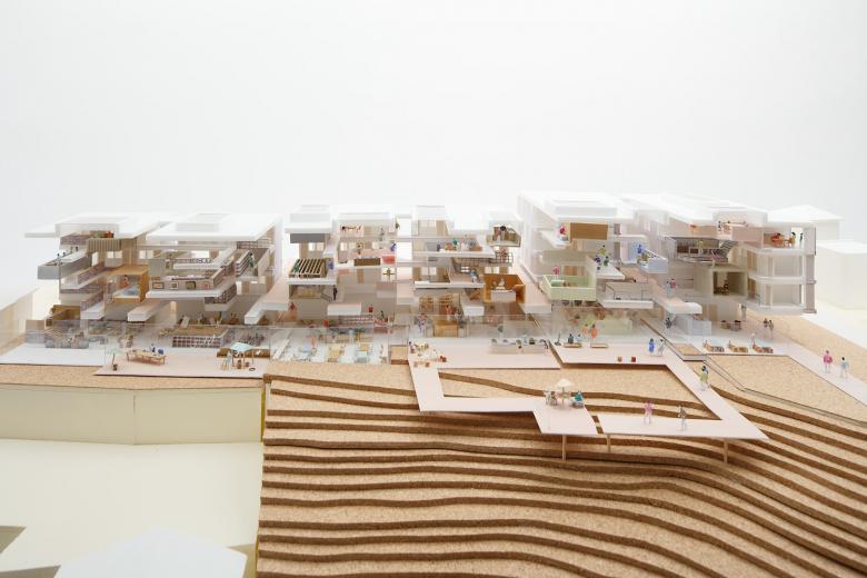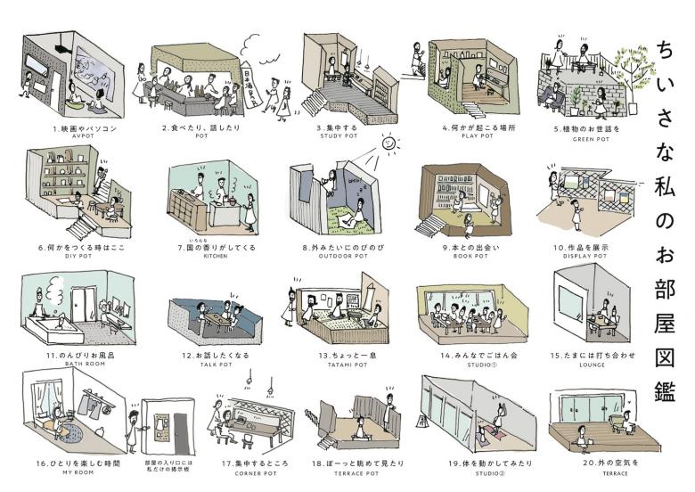 「共同生活を通した新しい交流空間の実現」を求められたプロポーザルから始まった、200人の学生が集まって暮らす学生寮の計画。 言語や食文化などの国や地域の文化・慣習だけでなく、個人の好みや気分で変化する暮らし方を含めた、一人一人が持つ多様な個人的バックグラウンドこそが交流のキッカケになると捉え、”ポット”と名付けた小さなリビングのような居場所が4層吹抜けの共用部に立体的に点在する学生寮を考えた。 ポットは10m²前後の居住スケールで、ひとつひとつの形、据え付けられた家具や仕上げも全て異なるようにした。 生活の大半を過ごす共用部に多様な居場所を複数用意することで、学生が主体的に居場所を選択して使うことや、そこでの出会いに期待している。 学生同士のコミュニケーションが固定的なものにならず、常に全体を感じながら偶発的で流動的な出会いがある「まちのような国際寮」を目指した。