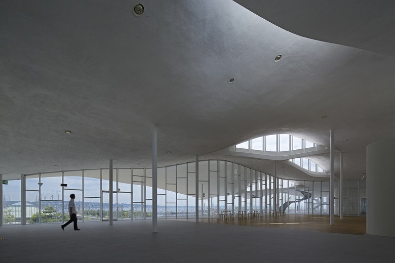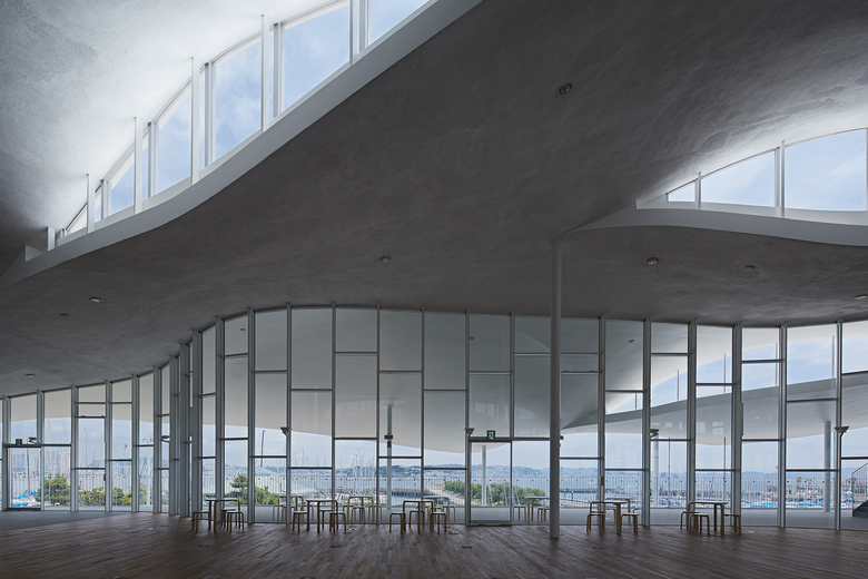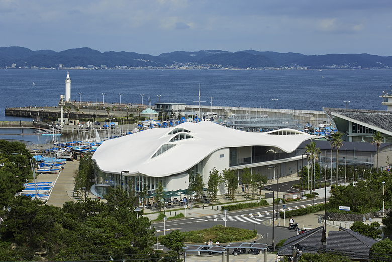 1964年に建てられたヨットハウス(谷口吉郎・山田水城設計)の建替え計画です。誰にも開かれたハーバー作りをテーマに、一般の人と馴染みが薄いヨットや港湾関連施設を地域に開く作法を考え、波のように光を受け止める屋根の下に、ハーバー利用者や一般利用者の居場所になる大きな空隙をもつ提案です。ホワイエから眺めるすばらしい湘南のパノラマを、江ノ島を訪れる様々な人にゆっくりと楽しんでもらえる空間と江ノ島の新しい拠点となることを目指します。