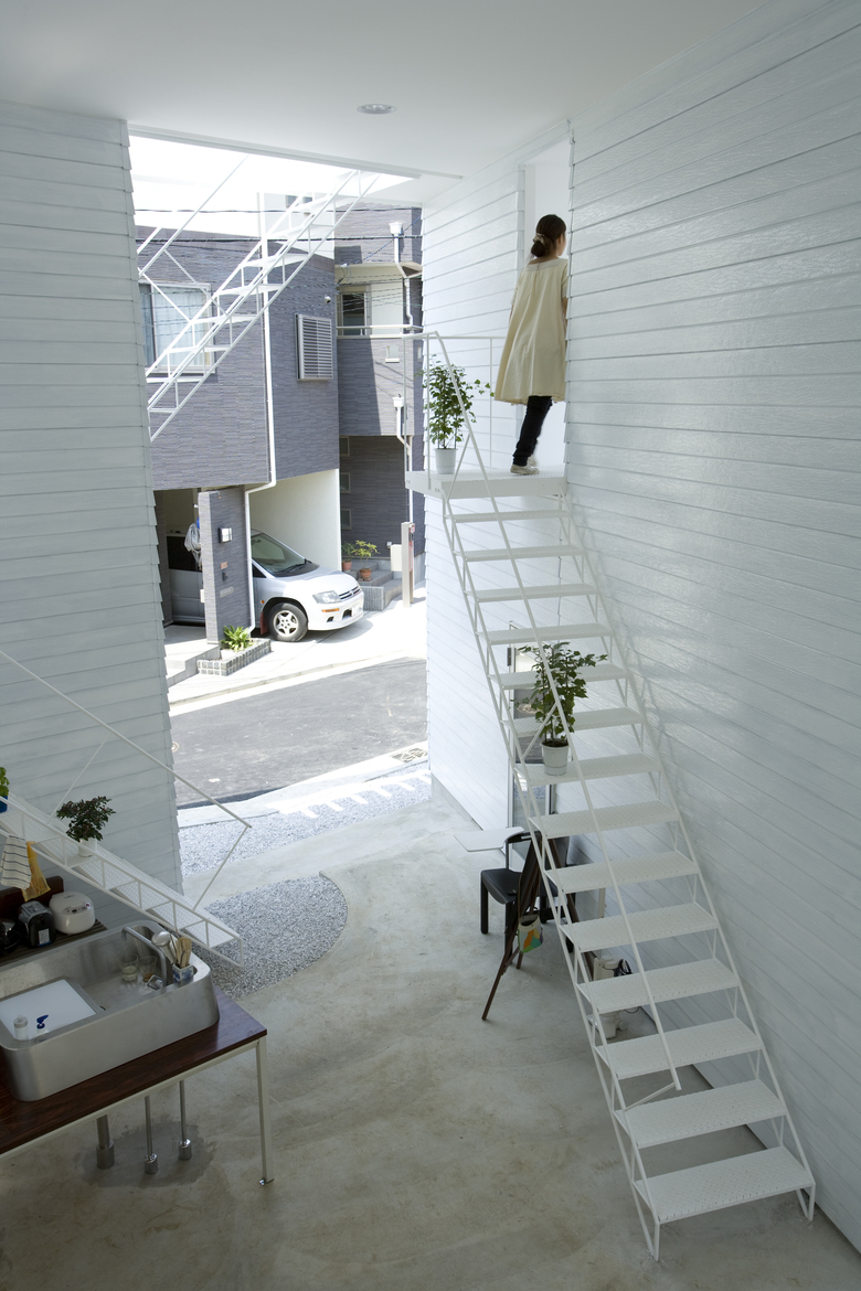 1階の共有広場は、近代建築の言語である「ピロティ」を単に空間の<形式>としてではなく、多様な生活を受け止め、助長するための<状況>として捉えた現代解釈であり、そこに『階段』と『3角形』という周辺環境から拾い上げた要素を加えることで、