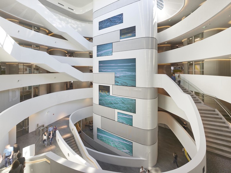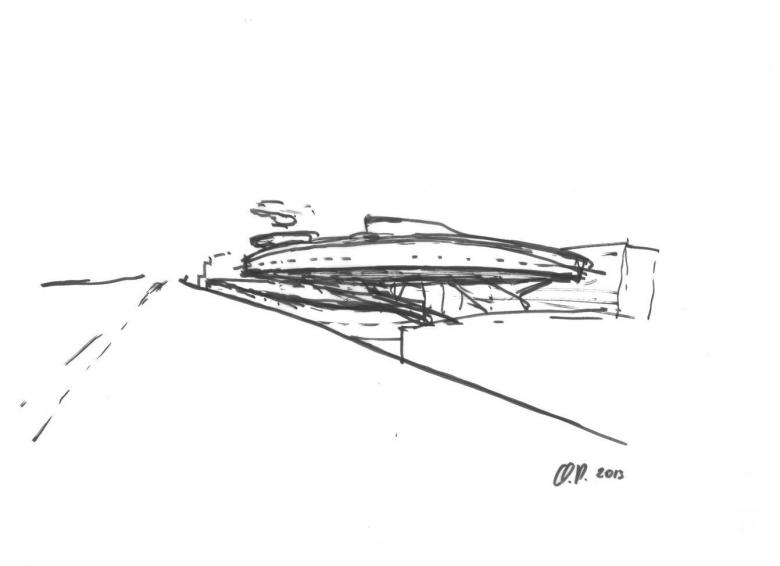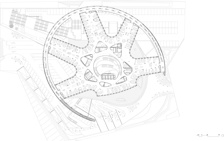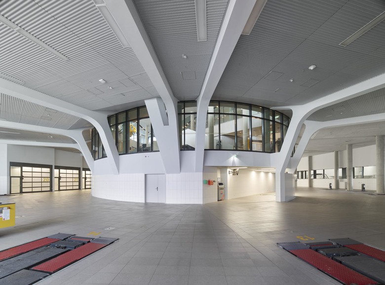 Von den Servicewerkstätten bis zum Heliport sind alle Programmelemente an einer einzigen vertikalen Achse aufgefädelt, also auch vom Schalter über den Empfang und die Veranstaltungsbereiche bis zum großen Atrium der Büros. Logistisch kompakte Inhalte mit hoher Effizienz, wie sie Stützpunkteinrichtungen per definitionem zueigen sind, wurden hier transformiert gedacht und in übersetzter Form auf das Gebäude übertragen.