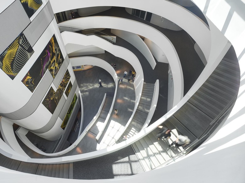 Alle Gebäudeteile kommunizieren untereinander – jedoch ist auch die Kommunikation nach außen wichtig. Diese findet im öffentlich / halböffentlichen Bereich statt: auf der Eingangsebene liegen Veranstaltungssaal, Konferenzräume, TV-Studio, auf der darüber liegenden Ebene das so wichtige Callcenter, das tatsächlich ständig mit außen online ist und das prononciert und funktionsgemäß als zentrischer Raum ausgebildet ist. Alle diese Bereiche liegen rund um ein zweigeschossiges Foyer herum angeordnet. Dieses ist aber zugleich auch die erste Ebene des großen Büroatriums, von dem aus die Weg- und Sichtbeziehungen nach oben führen. Damit ist wiederum der interne Kommunikationsfluss geschlossen.