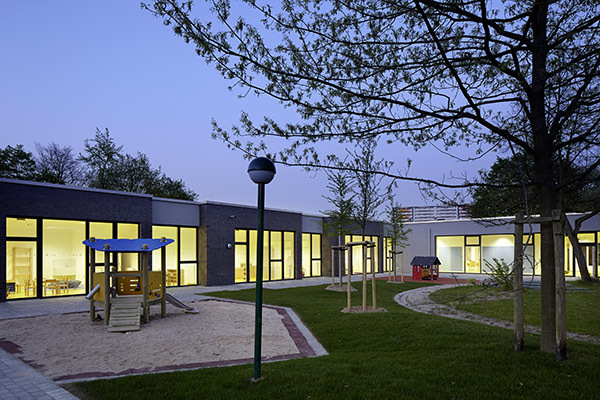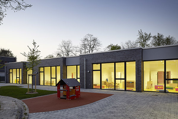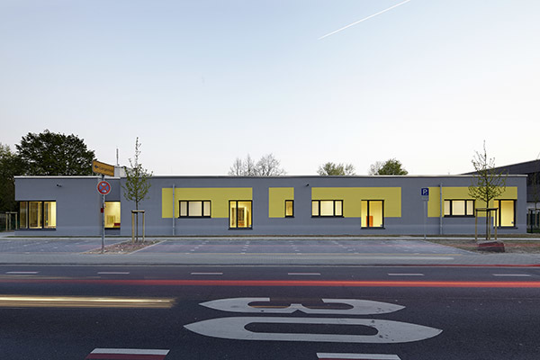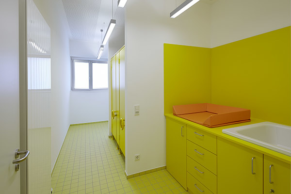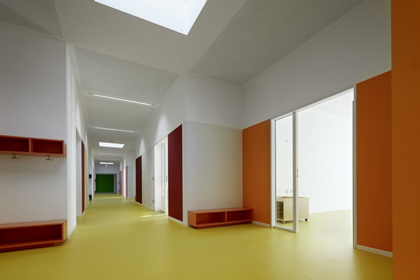 Gebaute Pädagogik. – Durch den Erweiterungsbau entsteht draußen ein Hof zum Spielen und Toben. Drinnen erschließt eine Spielstraße das Gebäude. Den Gruppenräumen ist jeweils ein Vorplatz zugeordnet. Lichtbänder neben den Türen ermöglichen Einblicke. Jede Gruppe hat einen direkten Hofzugang. Ein kindgerechtes Farbkonzept organisiert die Räumlichkeiten, das Mobiliar ist auf kleine und größere Kinder eingerichtet. Hier leben Kinder ihre Selbstständigkeit aus. Die komplette Glasfassade zum Innenhof bringt natürliches Licht ins Innere, genau wie Oberlichter. Das Energiekonzept wurde maximal optimiert, 3-Fach-Verglasung, Präsenzmelder, Tageslichtsteuerung und Fernwärme inklusive.