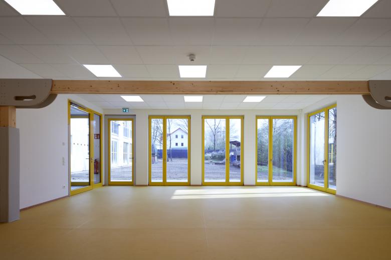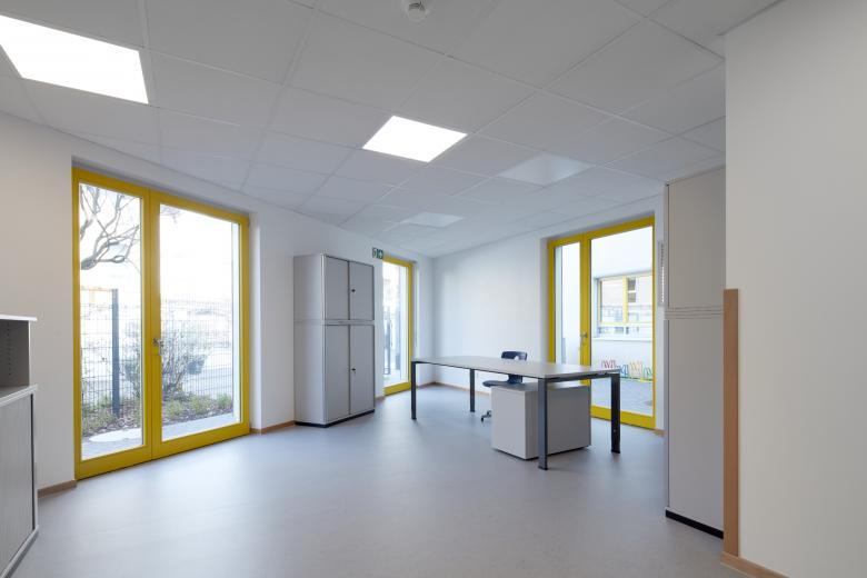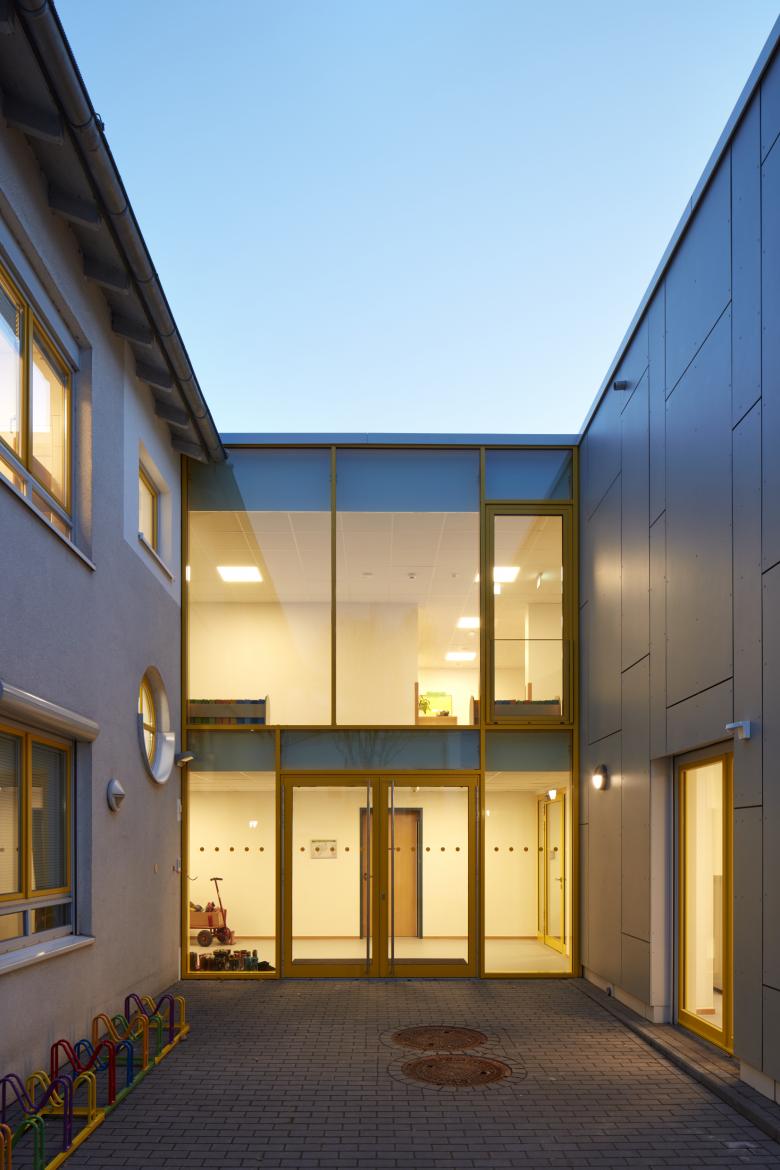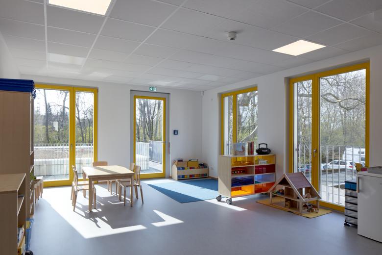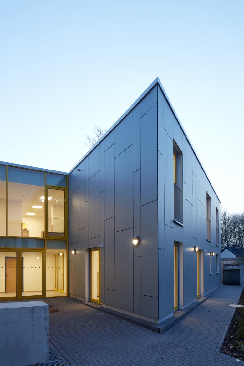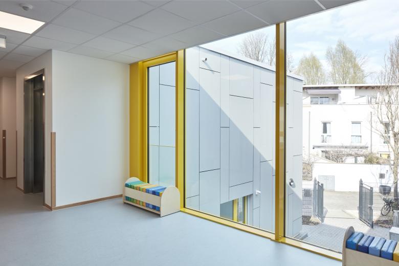 Mehr Platz für Kinder? Hier entlang: Bei laufendem Betrieb entsteht die Erweiterung von 677 auf 1237 qm Nutzfläche für die Kita an der Sulzbachstraße in Grafenberg. pier7 ergänzt den Bestand im Norden und eröffnet so die Freiflächen im Süden. Kompakter geht’s kaum. Alle Bereiche sind barrierefrei und über den Aufzug zu erreichen. Die vorgehängte Fassade ist hinterlüftet, die Gebäudehülle profitiert von der energetischen Optimierung. Großzügig verglaste Holz-/ Alu-Fensterelemente spendieren lichtdurchflutetet Räume, eine Raumakustik dämpft den Geräuschpegel. Den Akzent zur Begrüßung setzt die neue Eingangssituation.