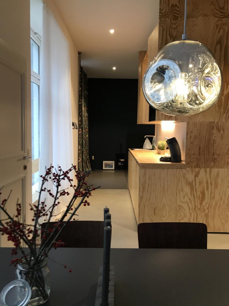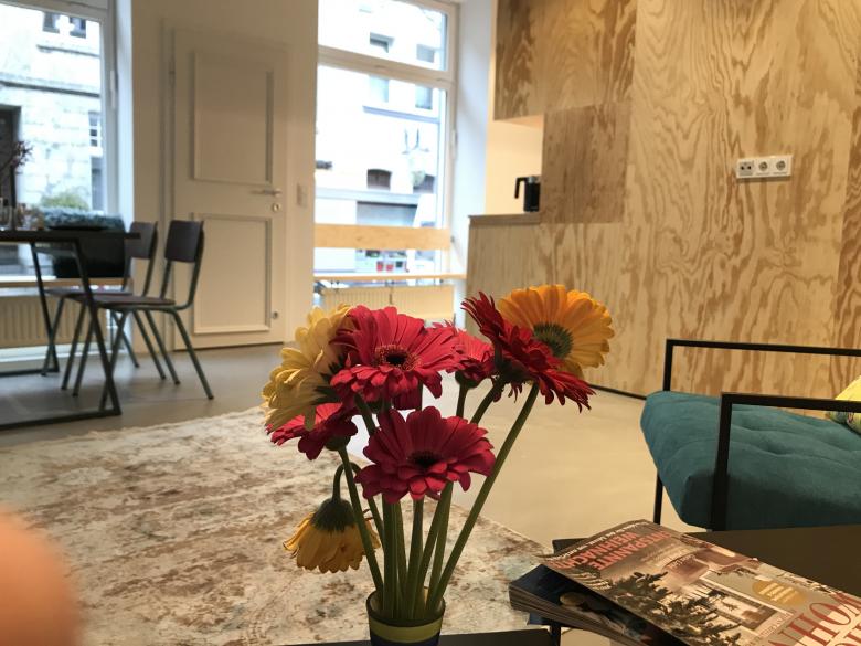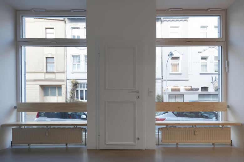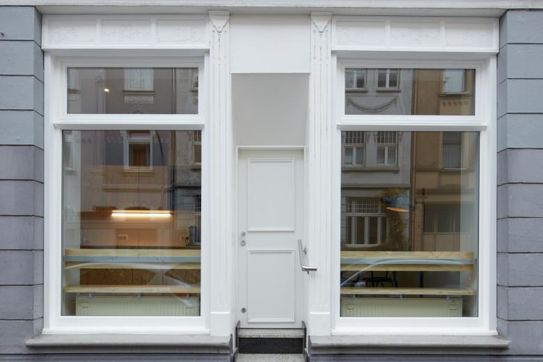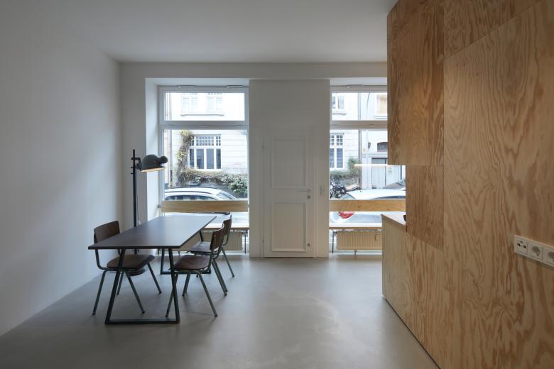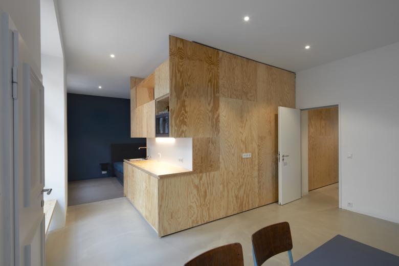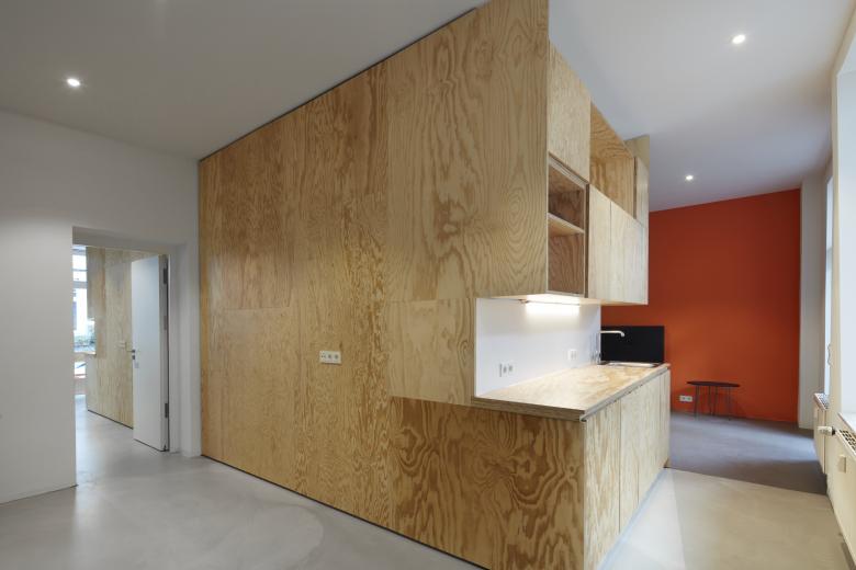 Auf zweimal 40 qm richtig viel Platz? Genau das schafft pier7 architekten durch den Umbau von einem Ladenlokal zu zwei Appartements im Gründerhaus. Minimalismus schlau geplant. Maximal fließender Raum entsteht durch jeweils einen Holzkubus, der einerseits Wohnen und Schlafen trennt, andererseits Bad und Küche komprimiert platziert. Nach vorne gibt’s wohliges Holland-Feeling in sattem Petrolblau. Hinten zum Garten leuchtet Freiraum in sonnigem Orange. Dazu passen Böden in Sichtestrich Grau und Tagesbelichtung für die Bäder. So einladend kann komfortabel möbliertes Wohnen in Düsseldorf Eller sein.