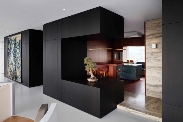 Behind the glass rectangle, a more closed volume presents a travertine façade to the outside world, while inside the spaces offer greater privacy and intimacy. The music room is lined in American walnut and features a large circular window with views over the harbor. The kitchen diner is executed in a sumptuous palette of mahogany wood, red travertine, matt gold resin and green serpentine stone. The master bedroom is crisply white, with the bathroom entirely covered in travertine. On the level below, in the original building, the three children’s rooms are treated as autonomous furniture objects in space and clad in American walnut. Organic materials like wood, stone, and leather plus slices of color – the pink glass wall next to the spiral staircase and the gold cabinets in the kitchen – add warmth to the interior. As a finishing touch, art is carefully curated throughout to create an integrated experience of space.