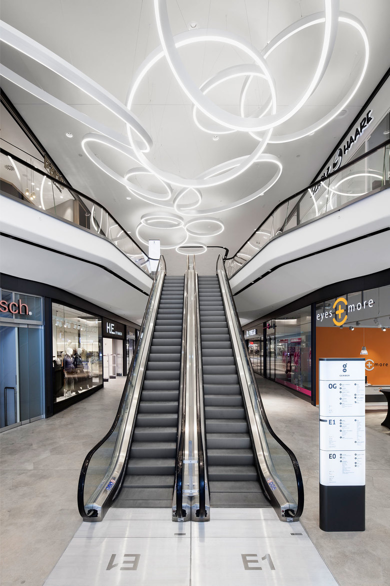 Weitere Highlights und "Big-Lights" sind die homogen leuchtenden Untersichten der Fahrtreppen; deren schwarze Fugen korrespondieren mit den Licht-/Technikkanälen, den Handläufen der Fahrtreppen und Brüstungen, mit den grauen Fassadenprofilen der Shops. Die so erzeugten Kontraste sind kein Zufall. Sie waren ein klares Ziel der Licht- und Interiordesigner. Ein dreidimenisonales, grafisch strenges Gesamtkonzept das bestehen kann neben der Viefalt der unterschiedlichen Geschäfte, Farben und Identitäten.