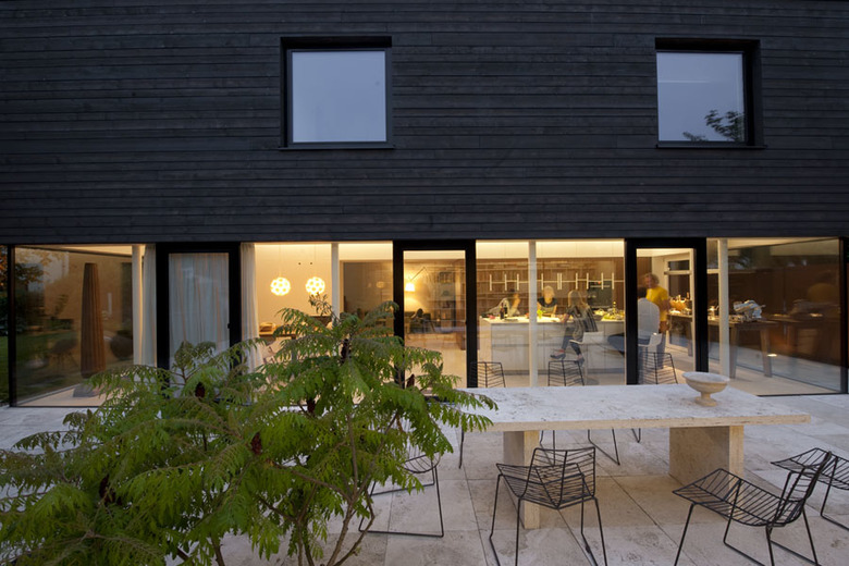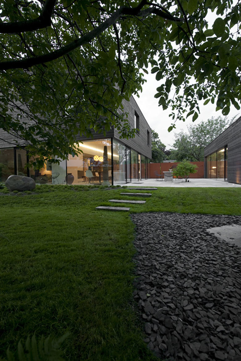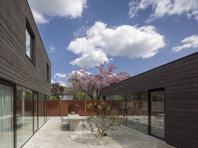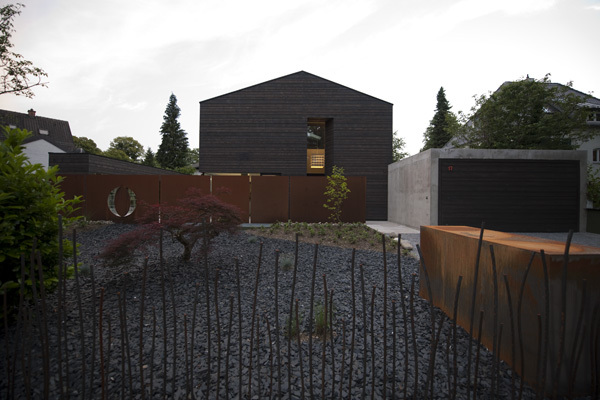 Statt eines klassischen Einfamilienhauses entstand in Pullach bei München ein Ensemble aus mehreren Bauten. Das zweigeschossige Wohngebäude mit Satteldach umfasst ein loftartiges, fast völlig offenes Erdgeschoss mit großzügigen Glasfronten sowie eine obere Etage mit Bädern und Schlafzimmern. Dem Wohngebäude ist ein eingeschossiges L-förmiges Gebäude gegenübergestellt, das als Bibliothek und Arbeitsplatz dient. Dazwischen ergibt sich ein privater Innenhof, der durch eine freistehende Wand aus Stahlplatten zur Straße hin abgeschirmt wird und vor unerwünschten Einblicken schützt. Trotz großer Transparenz entsteht durch klar definierte und zueinander in Beziehung stehende Innen und- Aussenräume ein zeitgemäßer Lebensraum, der zugleich Offenheit und Rückzug ermöglicht.