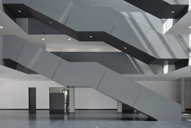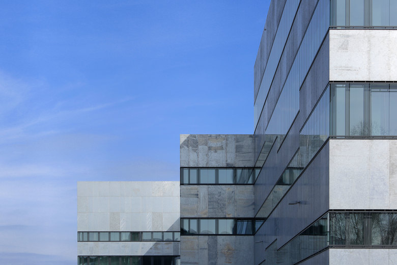 Im Inneren verknüpfen Verkehrsflächen und geschossübergreifende Lufträume die einzelnen Körper zu einem Raumkontinuum im Grundriss und Schnitt. Unterschiedliche Raumtiefen definieren tiefe Seminarräume beziehungsweise schmale Büroflächen und Nebenräume. Die durch diese Anordnung entstehenden Plätze, sowie eingeschnittene Höfe und geschossübergreifende Lufträume schaffen einen kommunikativen Ort mit unterschiedlichen Raumqualitäten für Lehrende und Lernende.