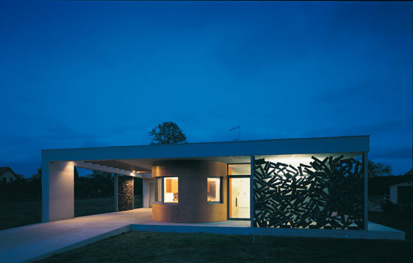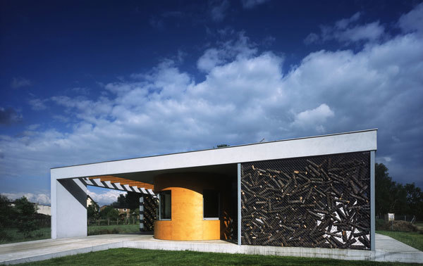 The plan of this bungalow is based on a square, where internal and external spaces are combined. The capsule containing all technological elements - bathroom, kitchen, pantry and an alternative source of heating in the form of a fireplace, is situated in the central part of the house. By each entrance there is a net used as wood storage. It acts like a screen changing its appearance depending on amount of wood inside.