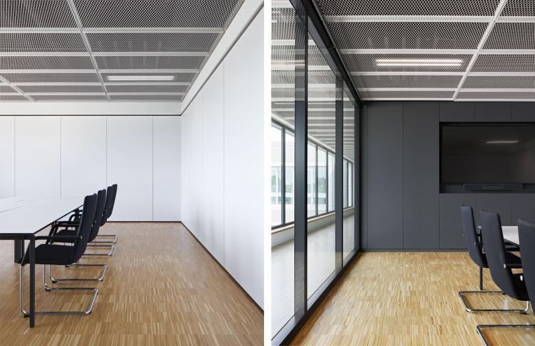 Im Obergeschoss mit Zugang zur Dachterrasse ist die neue Konferenzzone mit Cateringbereich angeordnet. Durch mobile Trennwände ist es möglich alle Konferenzräume zu einem großen Veranstaltungsbereich zusammenzulegen.