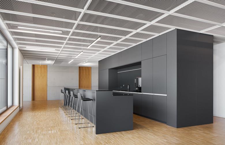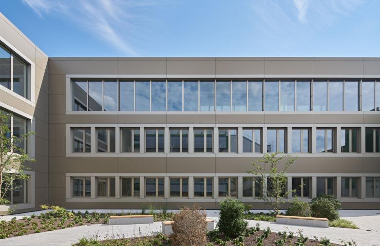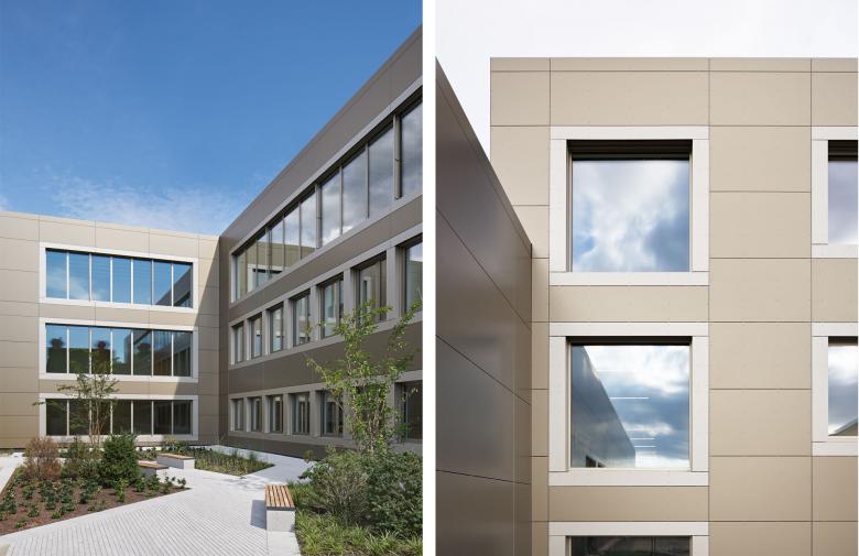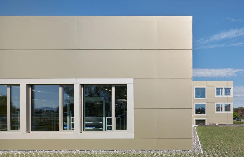 In einem nächsten Schritt wird das bestehende Bürogebäude saniert. Hierbei wird zum einen die Fassadengestaltung aus Aluminium-Verbundplatten des Neubaus auf das Bestandsgebäude übertragen. Zum anderen wird neben der Sanierung der Büroräume im Untergeschoss des Bestands eine Cafeteria realisiert, welche sich zum neuen Innenhof orientiert.