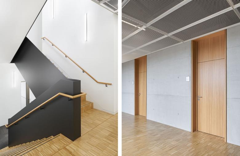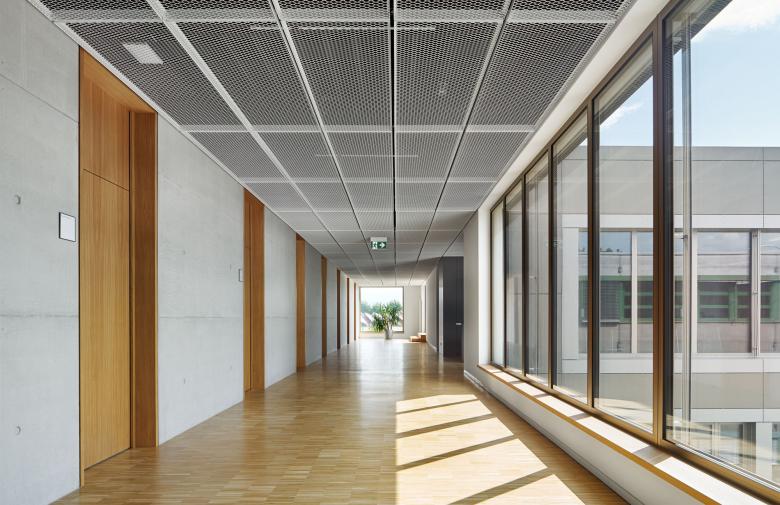 Im Innenbereich ist eine bewusst reduzierte Anzahl an hochwertigen Materialien konsequent verbaut: Sichtbetonwände, massives Eichenholz an Türen und Fensterbänke, Eiche-Parkett und eloxierte Aluminiumfenster. Die haustechnische Versorgung erfolgt an der Decke im Flur, alle für die Funktion notwendigen Elemente sind oberhalb der Streckmetalldecke angeordnet, selbst die Beleuchtung. Hierdurch erhält der Flur seinen aufgeräumten, ruhigen Charakter.
