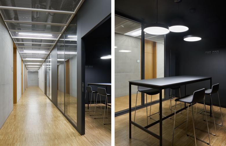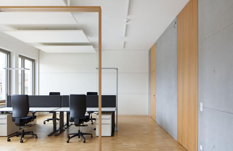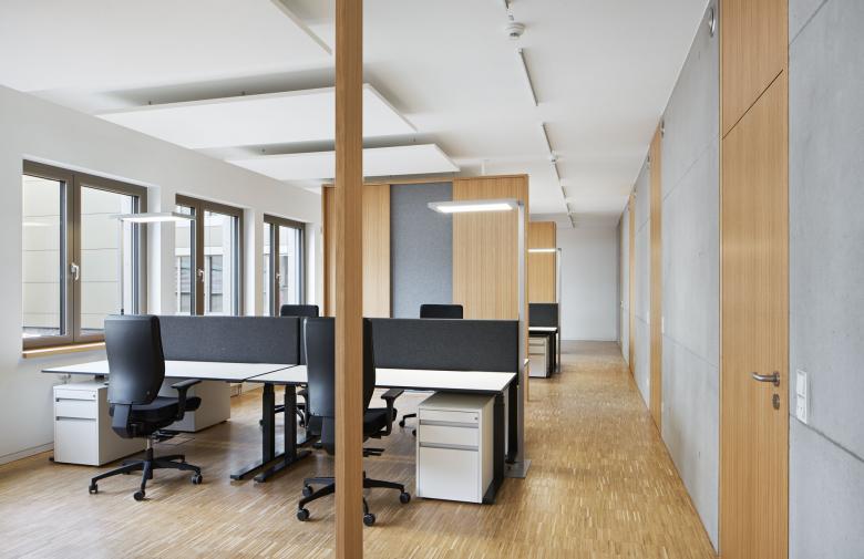 Im Bürogebäude können die Systemtrennwände je nach Raumbedarf verschoben werden, so dass moderne Büroräume in unterschiedlichen Größen entstehen. In großen Büroeinheiten sind je nach Arbeitssituation akustisch wirksamen Raumteiler flexibel einsetzbar. Ergänzt werden die Büroräume durch moderne Teeküchen und offene Aufenthalts- und Besprechungsbereiche, die sich in den breiten, großzügig verglasten Flurzonen befinden.