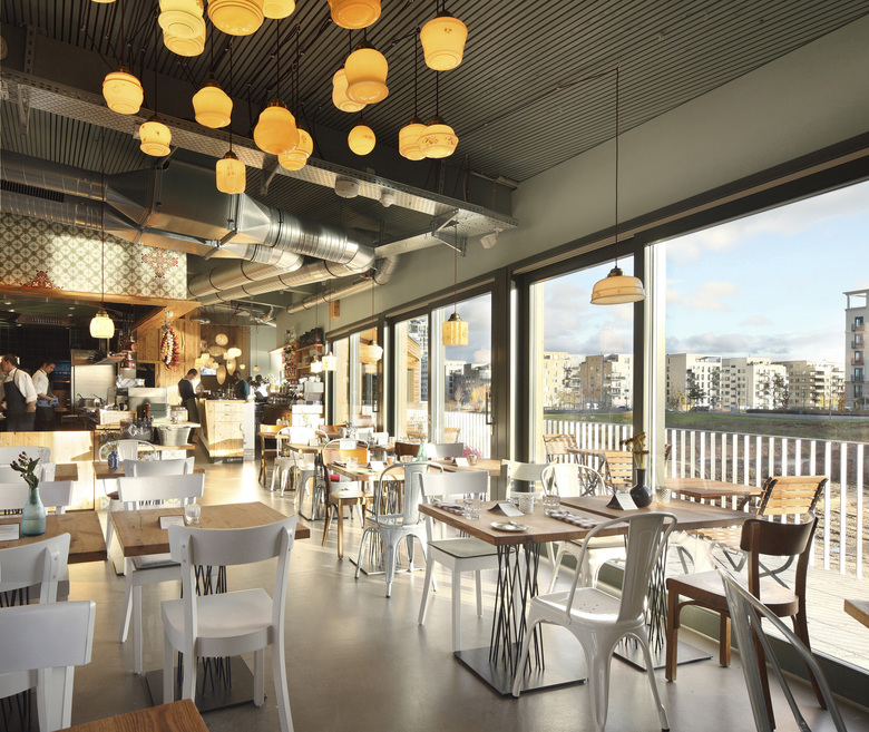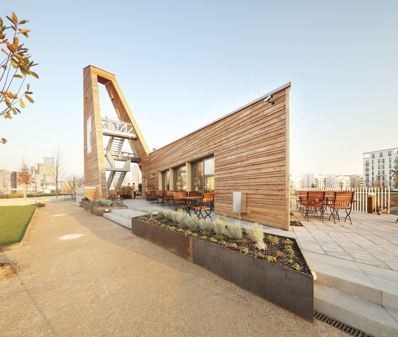 Das dreiflügelige Holzbauwerk mit Holzfassade wurde von Franken Architekten im Auftrag des Bauherrn Aurelis Real Estate entworfen, um den Menschen in der zentralen Grünanlage Europagarten einen sichtbaren Identifikations- und Treffpunkt zu bieten. Laube Liebe Hoffnung ist ein Restaurant mit Veranstaltungsraum, Außenterrasse und 14 Meter hohem Aussichtsturm. Die markante raumbildende Gestalt des multifunktionalen Pavillons ist von Weitem durch die Positionierung am Schnittpunkt des Parkwegs und der Promenade an der Pariser Straße gut sichtbar. Die Pavillon-Geometrie entwickelt sich aus einer kontinuierlichen skulpturalen Faltung, die sich über drei Gebäudeflügel spannt. Am Schnittpunkt beider sich zu den Spitzen verjüngenden Flügel faltet sich der dritte Flügel in die Vertikale und bildet so den Turm. Die Struktur des Gebäudes ist eine Holzständerkonstruktion mit Lärchenholzfassade, die inszenatorisch mit der Interpretation einer modernen Gartenlaube spielt. Dieses Motiv wird in der Innenraumgestaltung der Gastronomie weiterentwickelt.